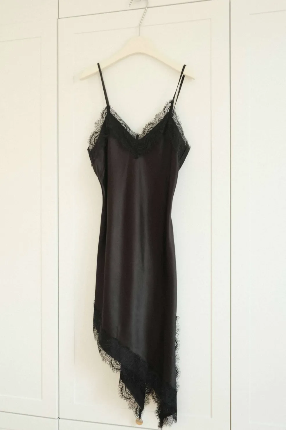 Sort kjole fra Noella i satin. Kjolen har tynde, justerbare stropper, blonde detaljer og en asymmetrisk kant, der går til knæet.