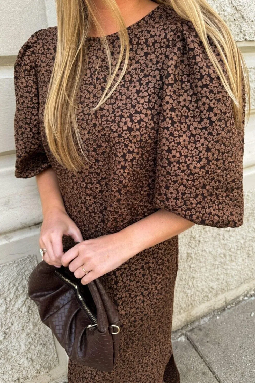 Lang kjole fra Noella i brun med små blomster. Kjolen har korte pufærmer, rund hals og en løs pasform. Bindebåndet på ryggen og slidsen i begge sider giver bevægelsesfrihed.