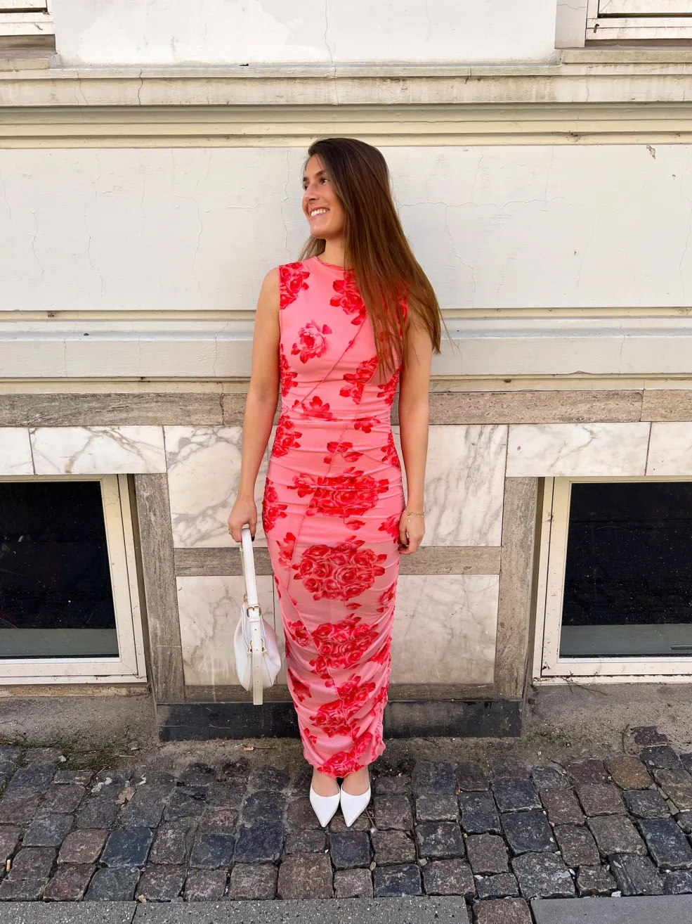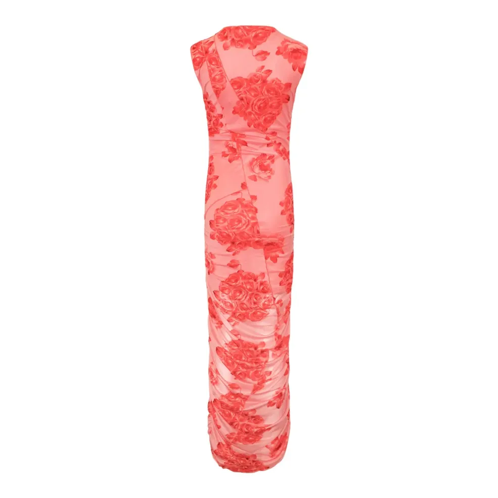 Tætsiddende kjole fra Noella i lyserød med røde roser. Kjolen har rynkeeffekter og et højtsluttende design uden ærmer. Den lange længde når til læggene.