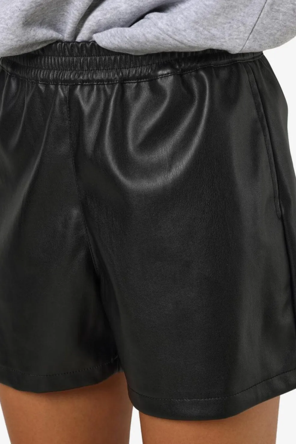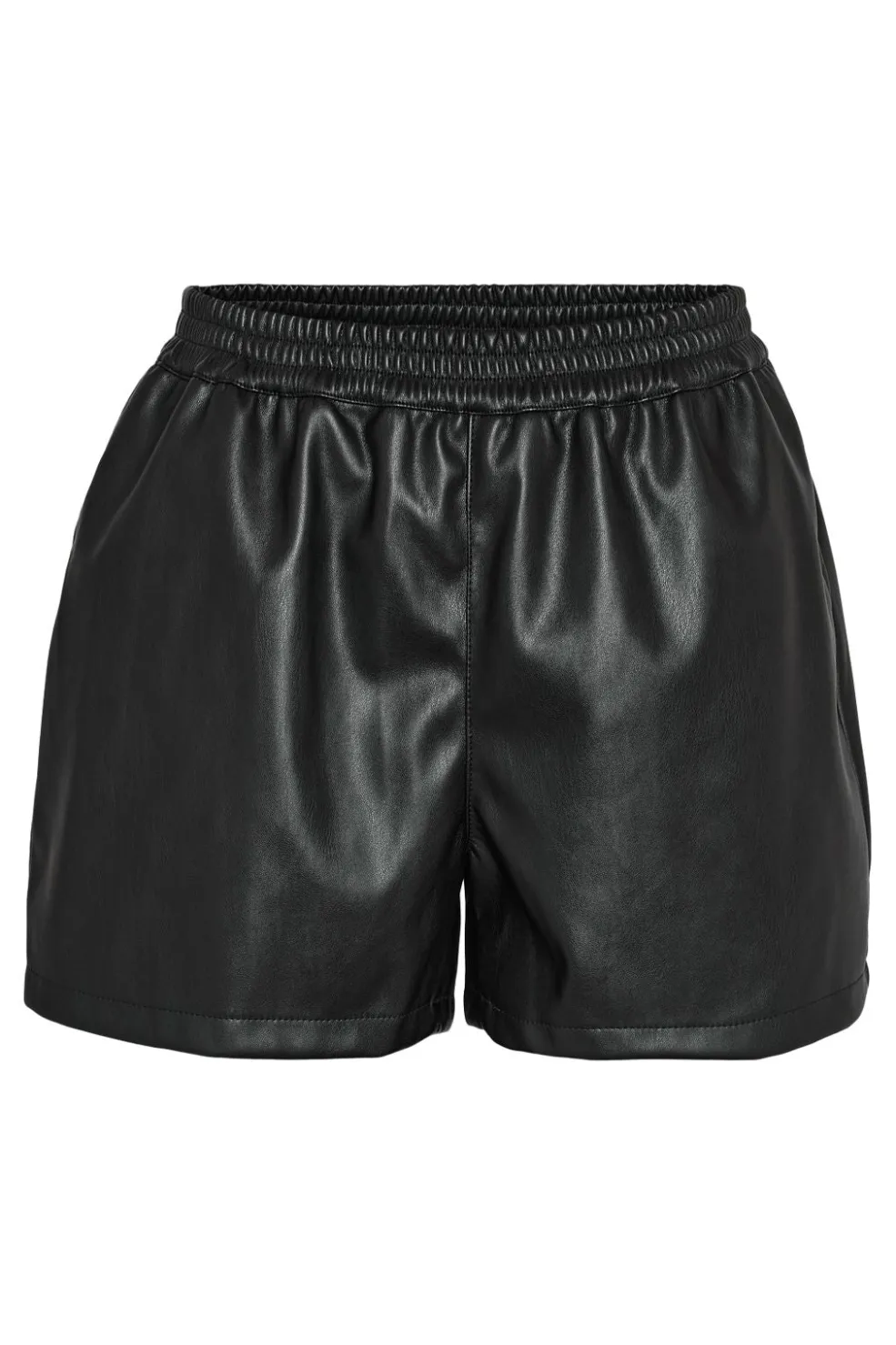 Sorte shorts fra Noisy May i PU-belagt materiale med et skinnende læderlook. Shortsene har høj talje og flæser.