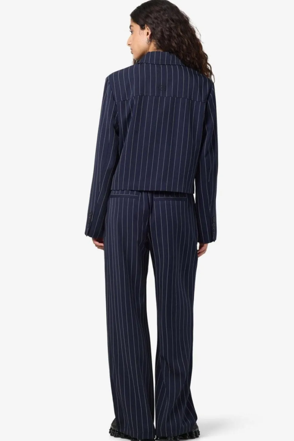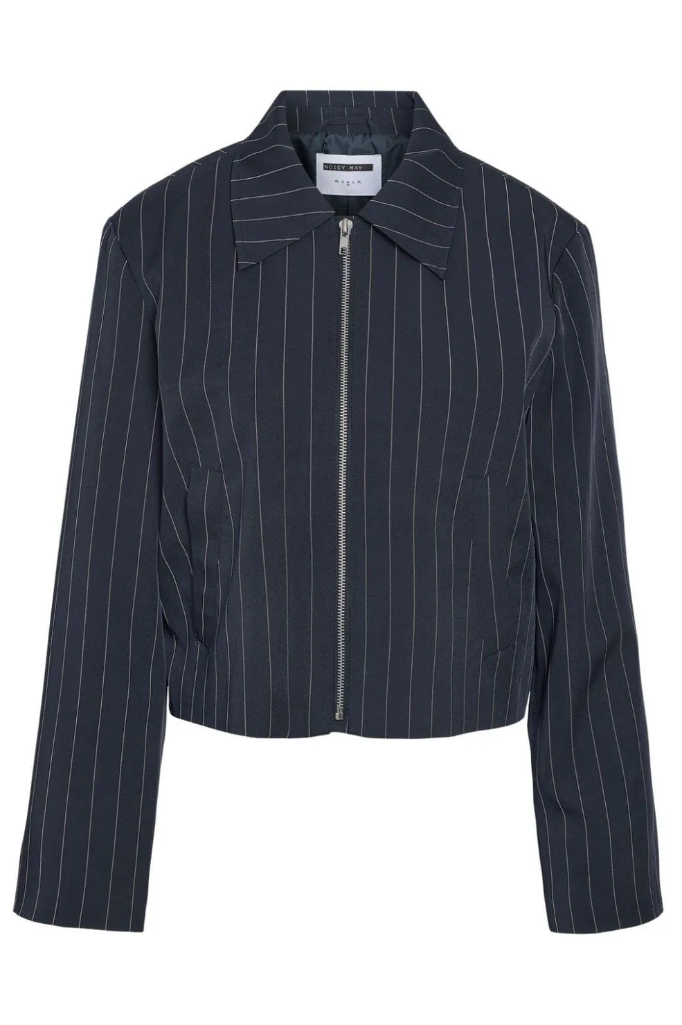 Jakke fra Noisy May i mørkeblå med hvide striber. Jakken har en klassisk skjortekrave og en lynlåslukning foran.
