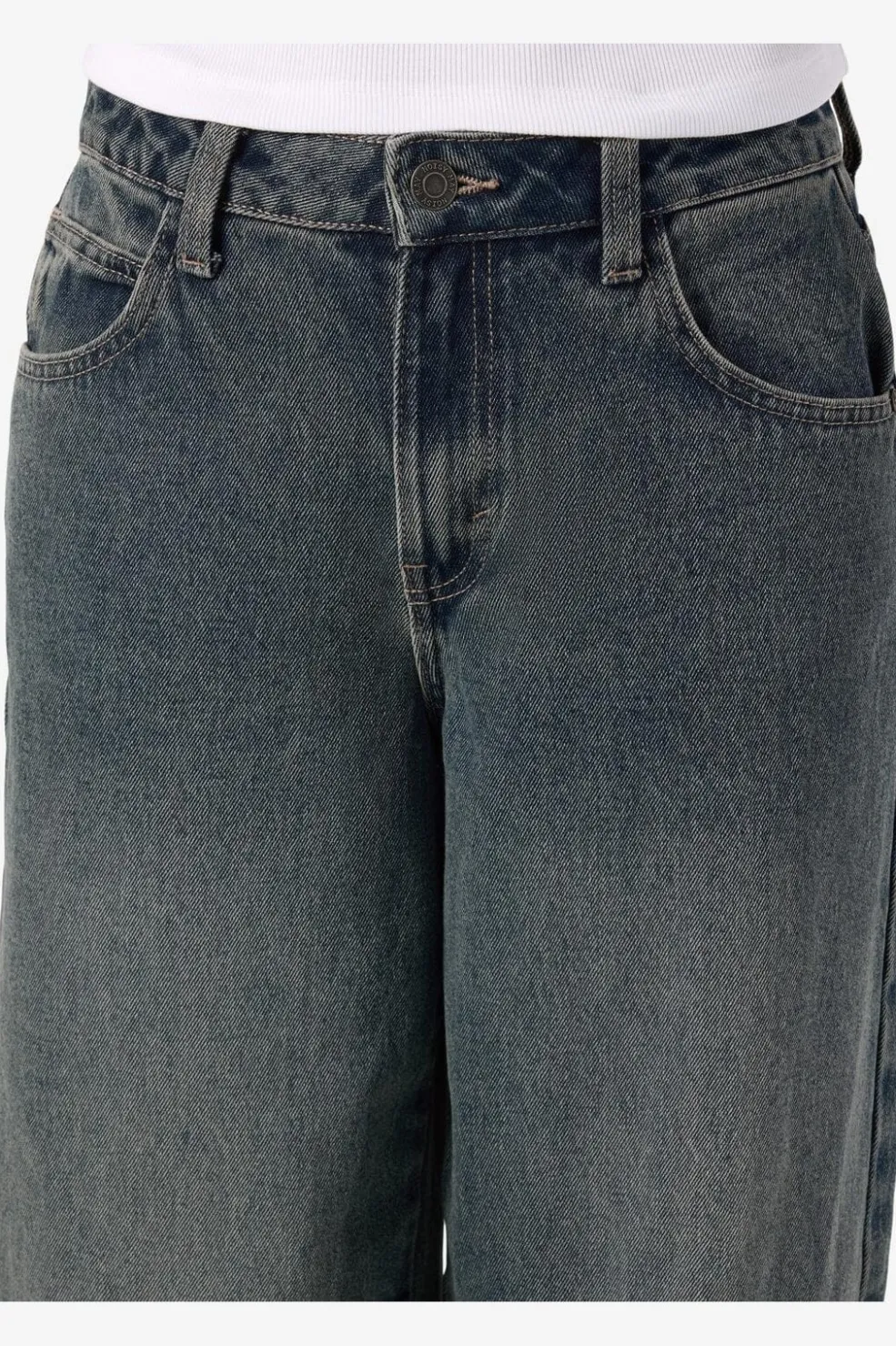 Jeans fra Noisy May i mellemblå denim. Løs pasform med brede ben og ankellængde. Almindelig talje med bæltestropper og to baglommer.