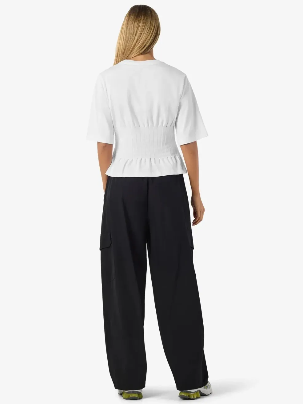Fitted t-shirt fra Noisy May i hvid med Nm-logo. T-shirten er lavet af 100 % økologisk bomuld og har dekorative syninger og flæser.