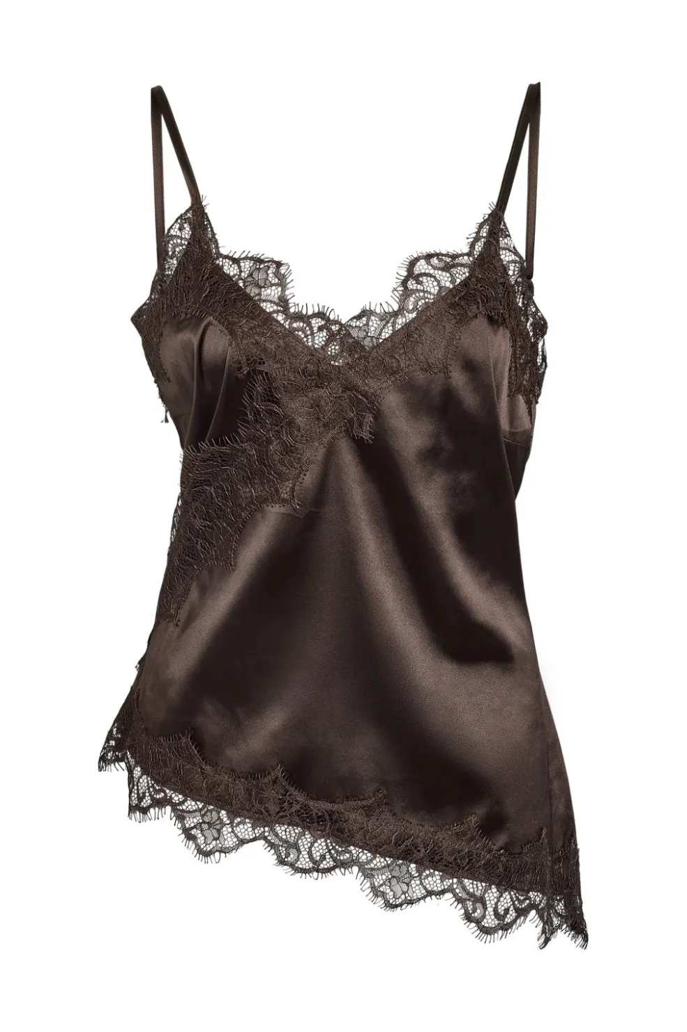 Satin top fra Noisy May i en chokoladebrun farve. Toppen har en skinnende overflade og blonde detaljer langs V-udskæringen og forneden.