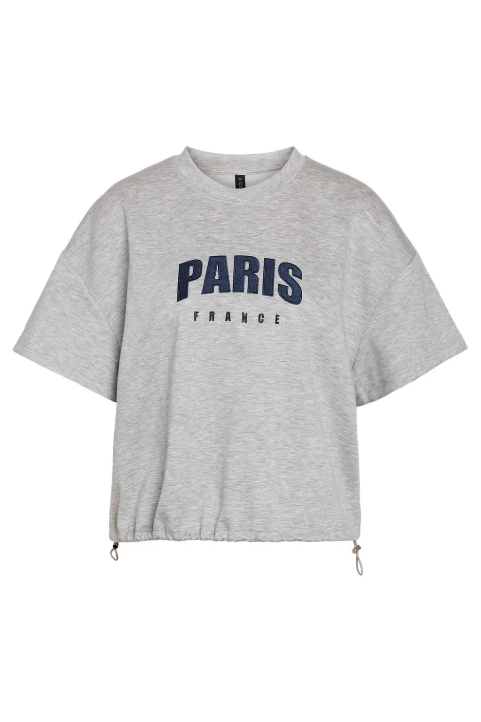 Sweat T-shirt fra Noisy May i lys grå melange med Paris France-tryk på fronten. Den har korte ærmer og en justerbar snor i bunden.