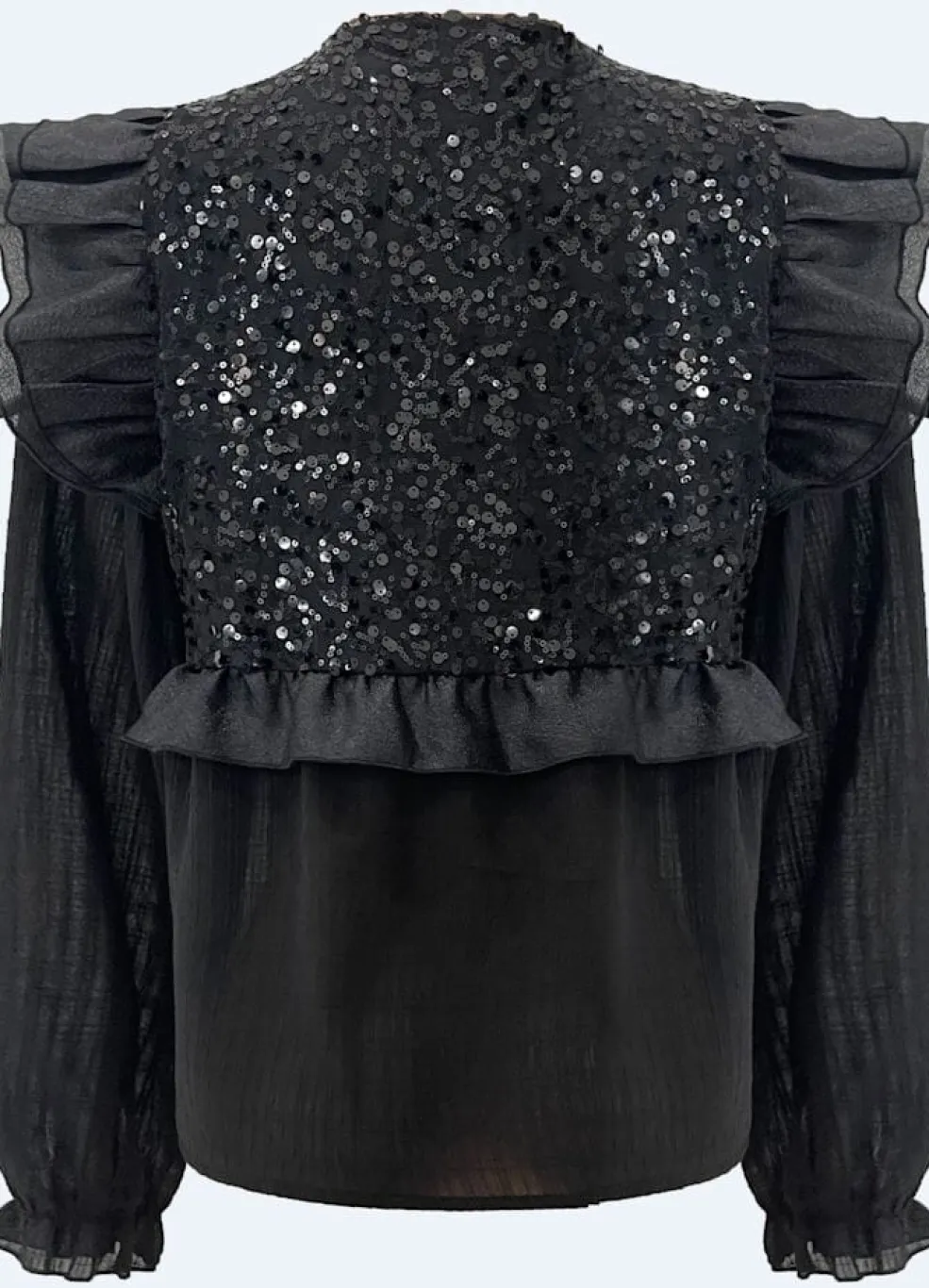 Sort bluse fra Liberte med skinnende pailletter på fronten. Blusen har lange gennemsigtige ærmer med flæsedetaljer ved skuldrene og en justerbar snor ved halsudskæringen.