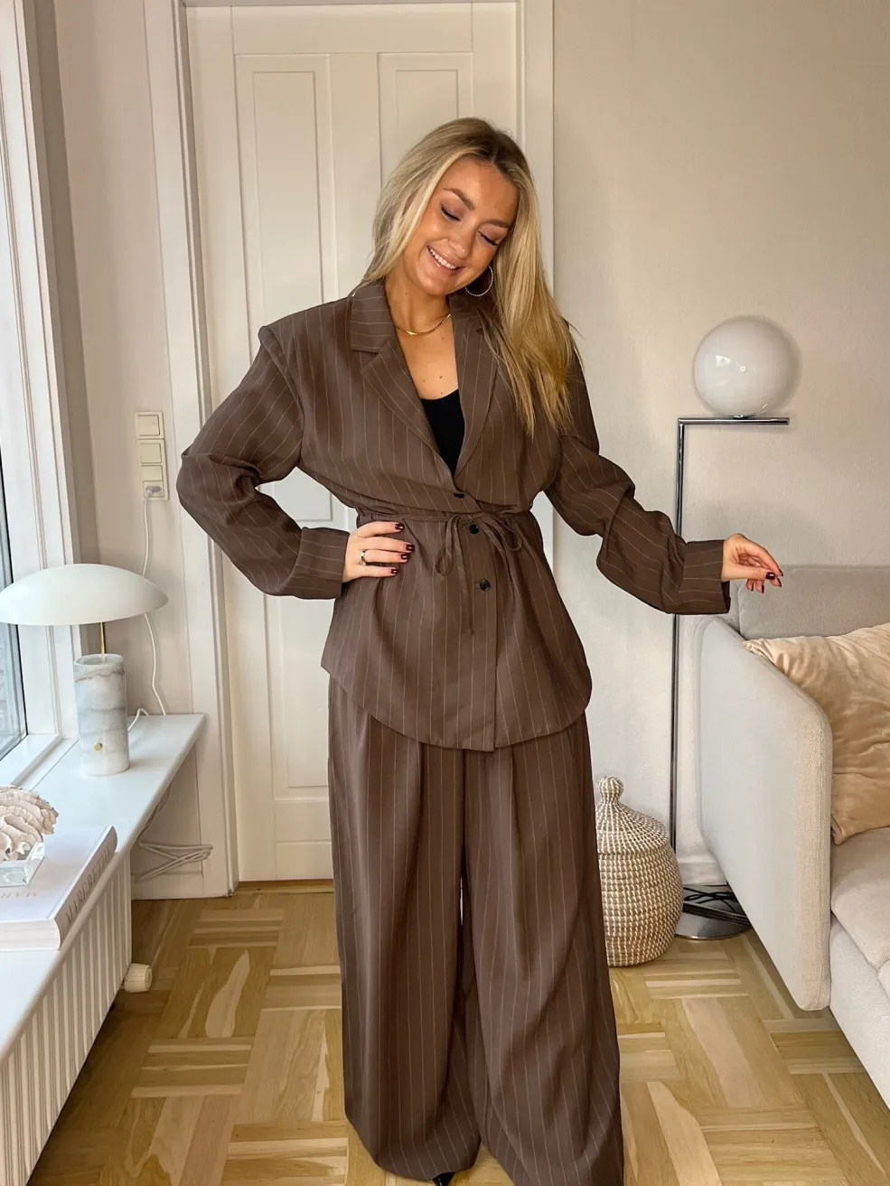 Brune bukser fra Dear Molly med stribemønster. Bukserne er lavet af vævet materiale og har en gulvlang længde med høj talje og bindebånd.