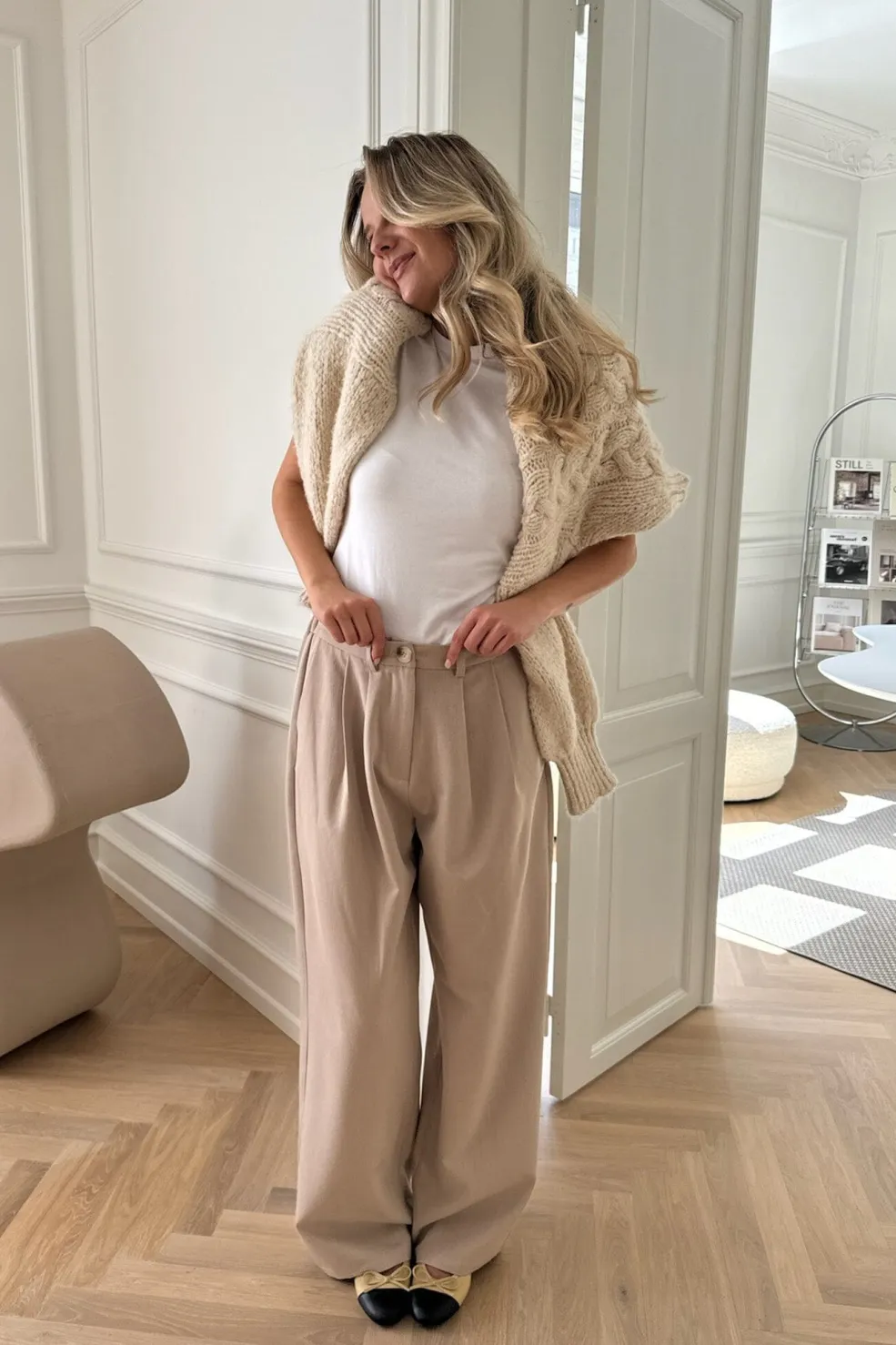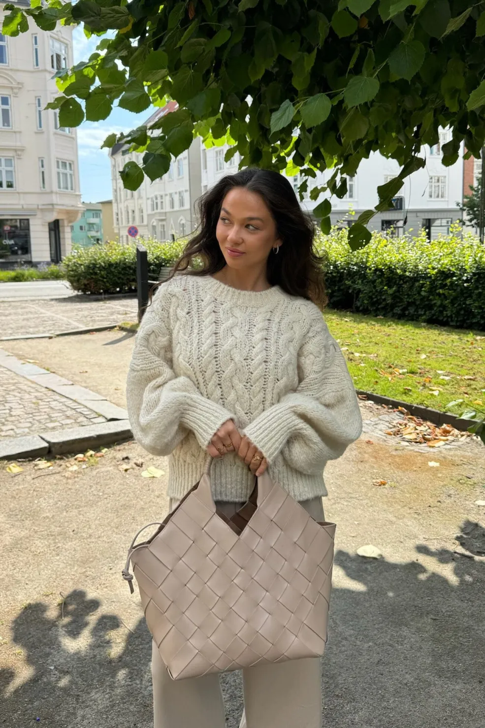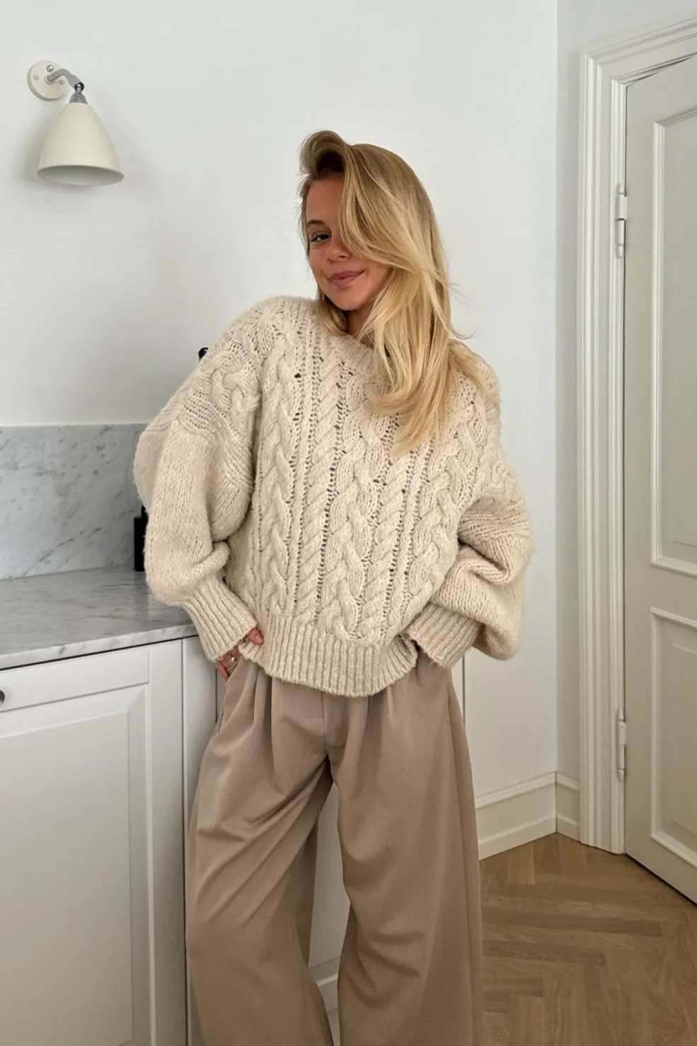 Off-white sweater i chunky strik fra BYIC. Kabelmønstret og ballonærmerne skaber et strikdesign med tydelig struktur og karakter.