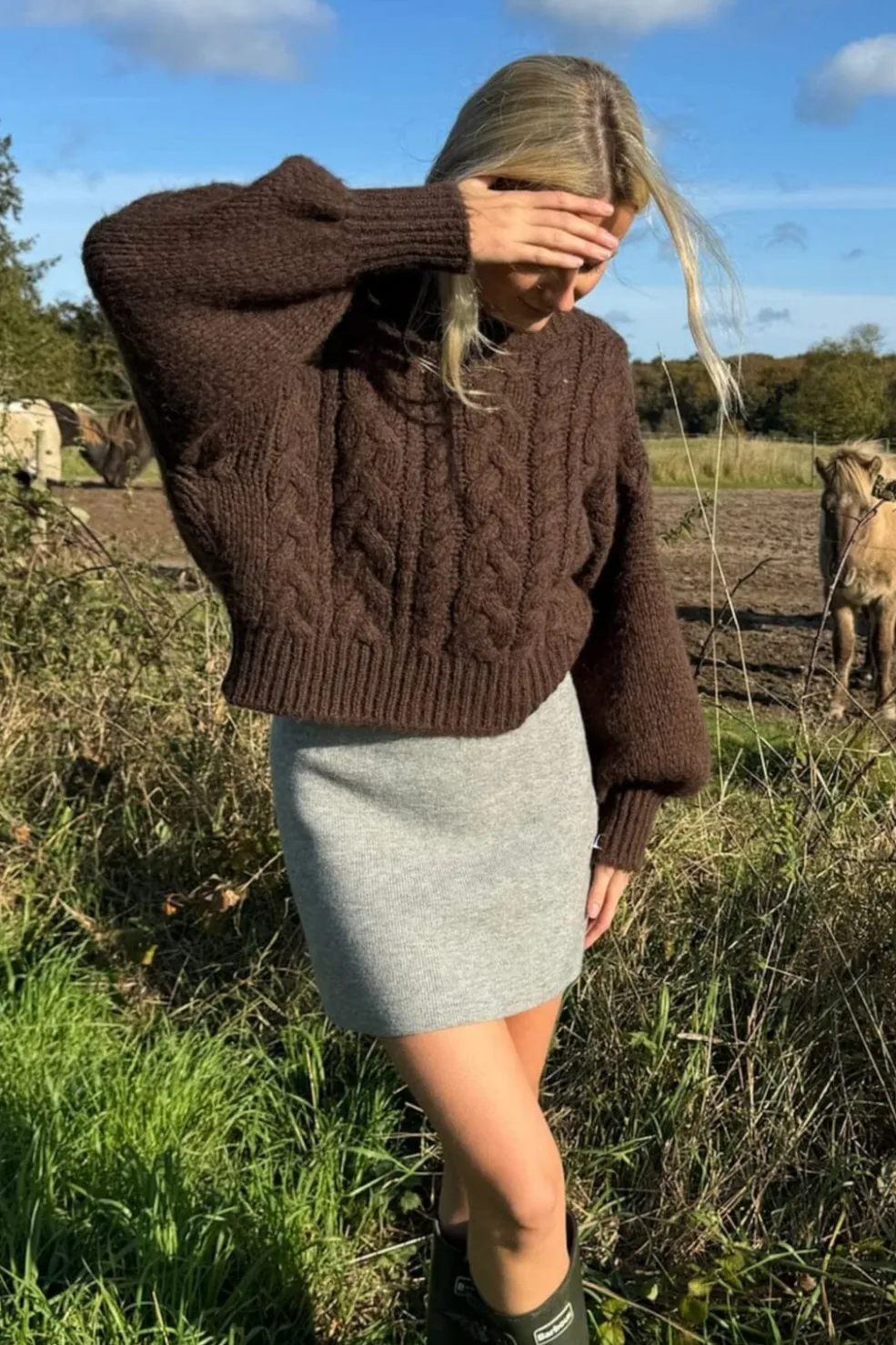 Chokoladebrun sweater fra BYIC med kabelstrikmønster. Den løse pasform og det tykke strik giver sweateren et rustikt udtryk med god varme.