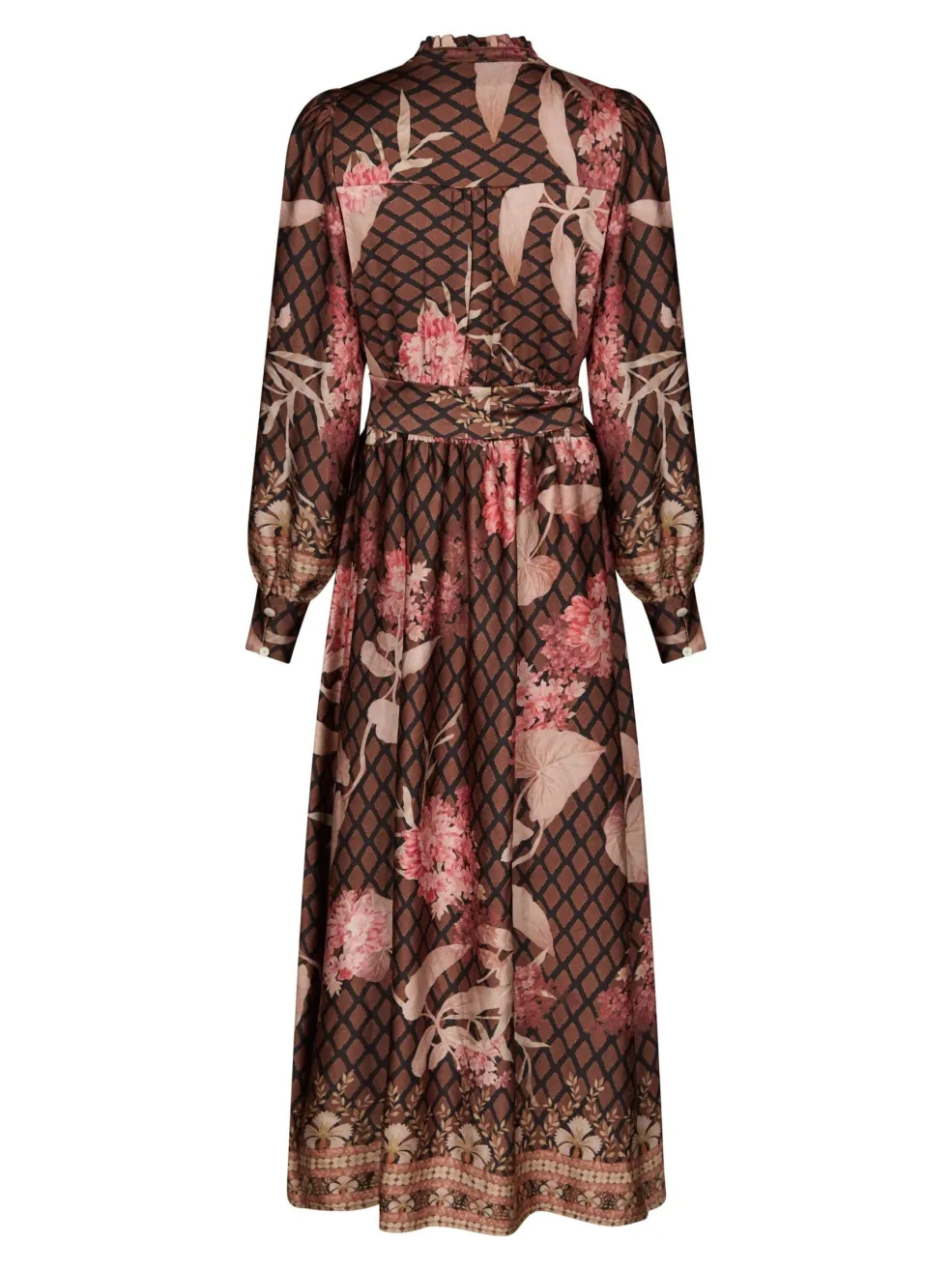 Sort ankellang kjole fra Neo Noir med et mix af blomster- og ternmønster. Kjolen har knapper foran og bindebånd i taljen, der giver mulighed for at justere pasformen.