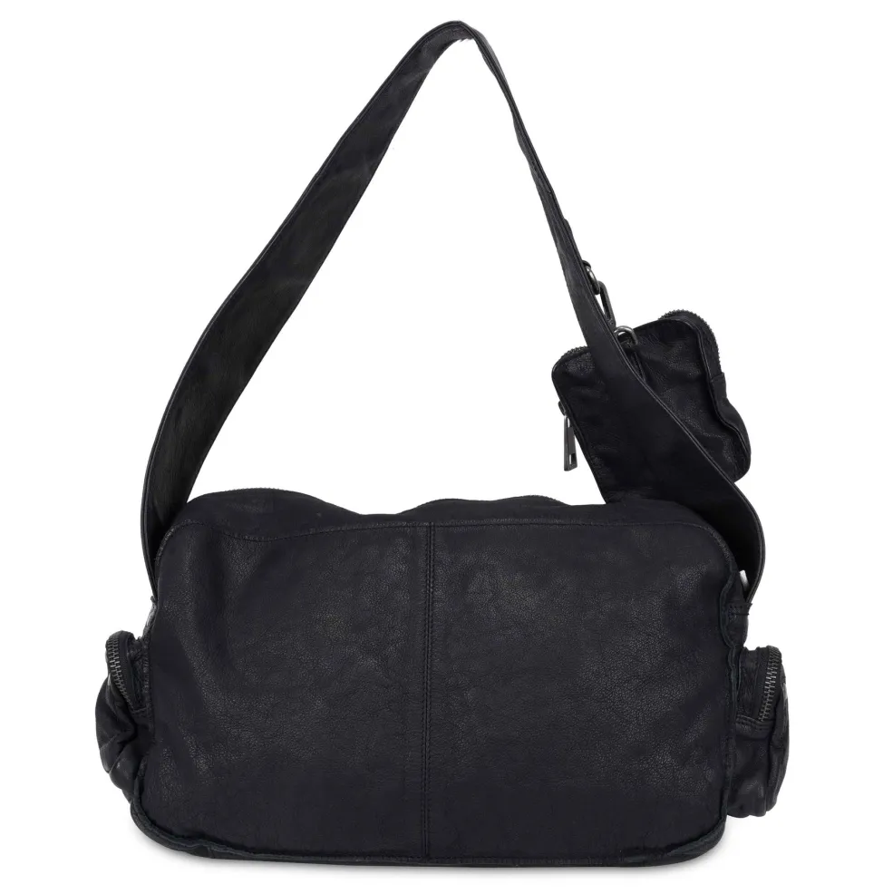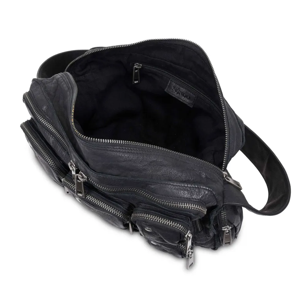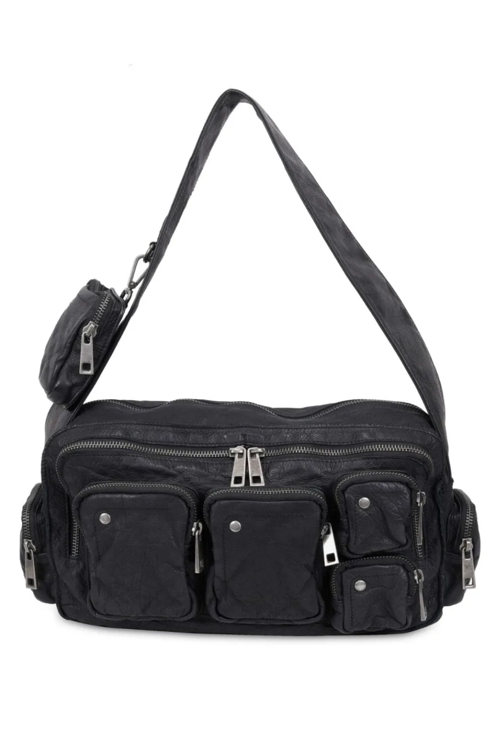 Sort skuldertaske fra Núnoo med flere udvendige lommer og sølvfarvede detaljer. Tasken har en aftagelig pung og forskellige rum til organisering af indhold.