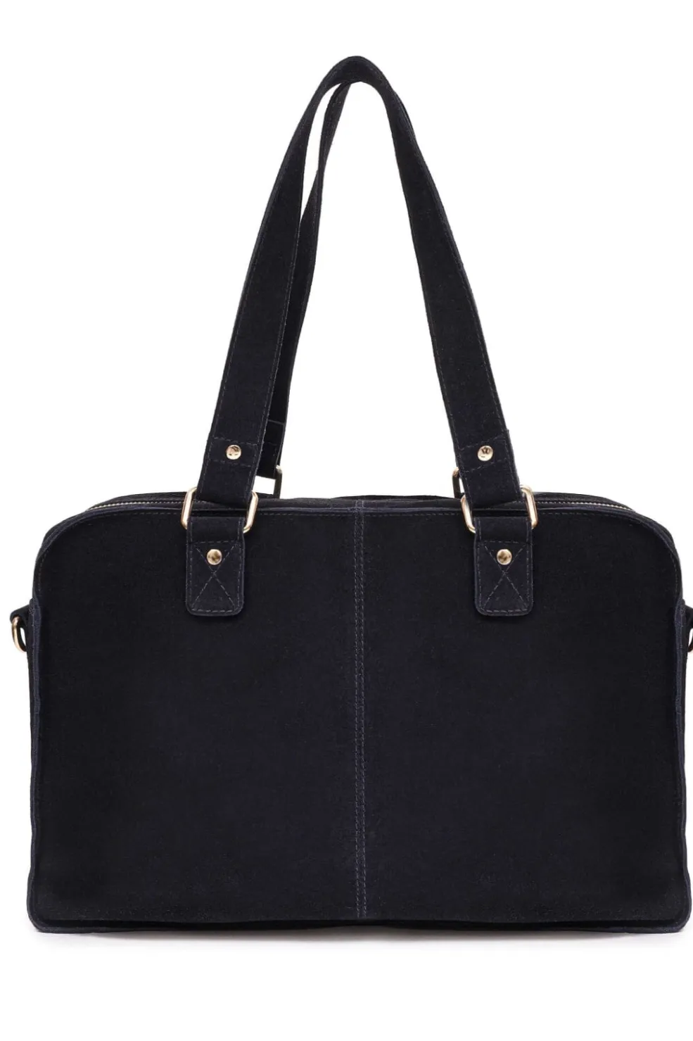 Mørkeblå ruskindstaske fra Núnoo med gyldne detaljer. Tasken har flere lynlåslommer på forsiden og en praktisk skulderrem.