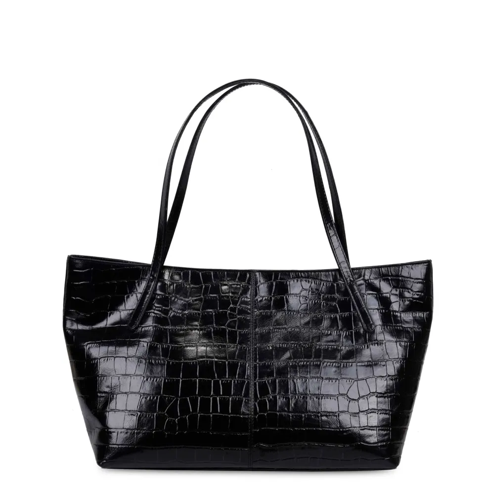 Sort shopper fra Núnoo med et karakteristisk flettet design. Tasken har et stort hovedrum med flere indvendige lommer og lange skulderstropper.
