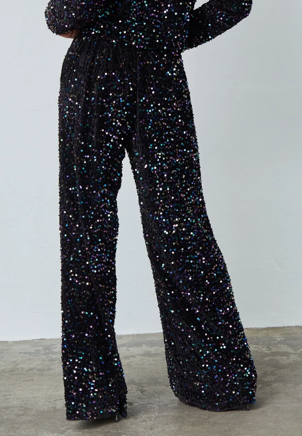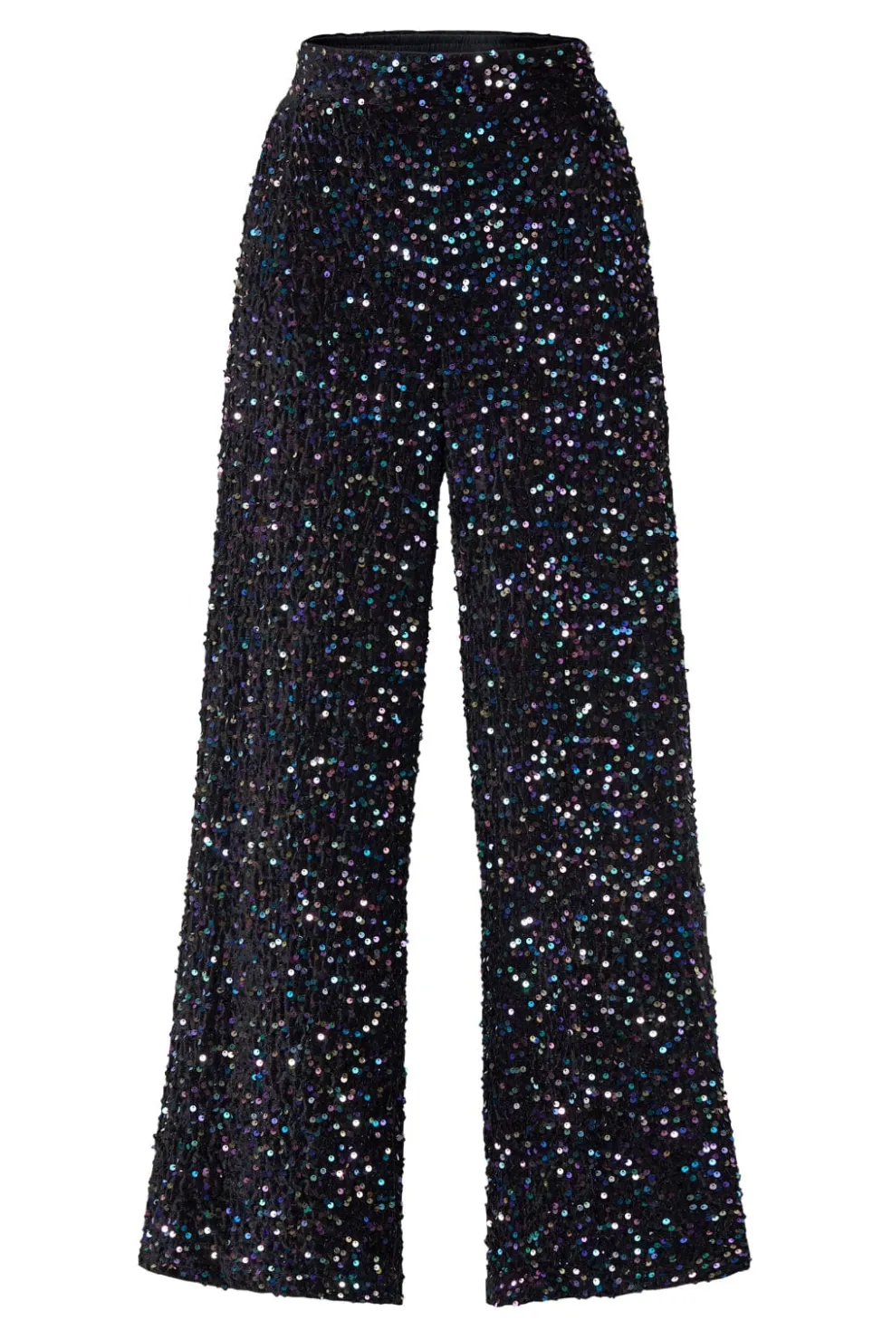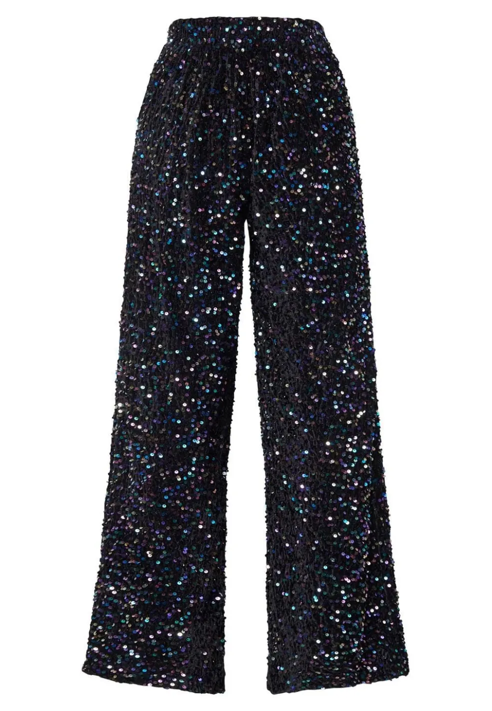 Sorte bukser fra Sisters Point med løs pasform og brede ben. Bukserne er dækket af mangefarvede pailletter, der skaber et festligt udtryk. Elastikken i taljen giver en god pasform.