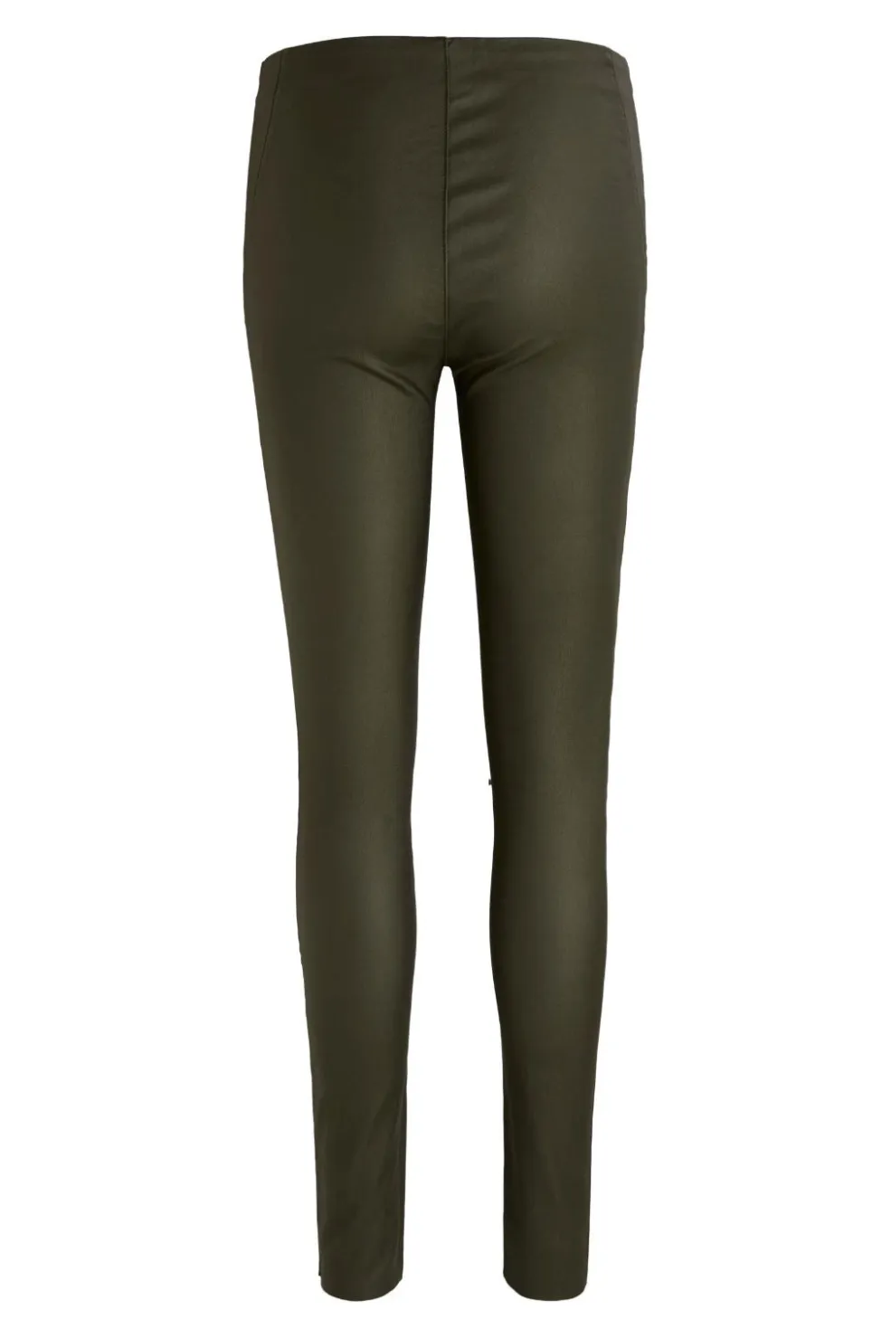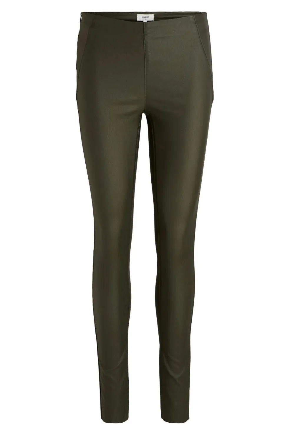 Mørkegrønne leggings fra Object med belagt overflade. Den dybe skovgrønne farve passer til både hverdag og fest, og lynlåsen i siden gør dem nemme at tage af og på.