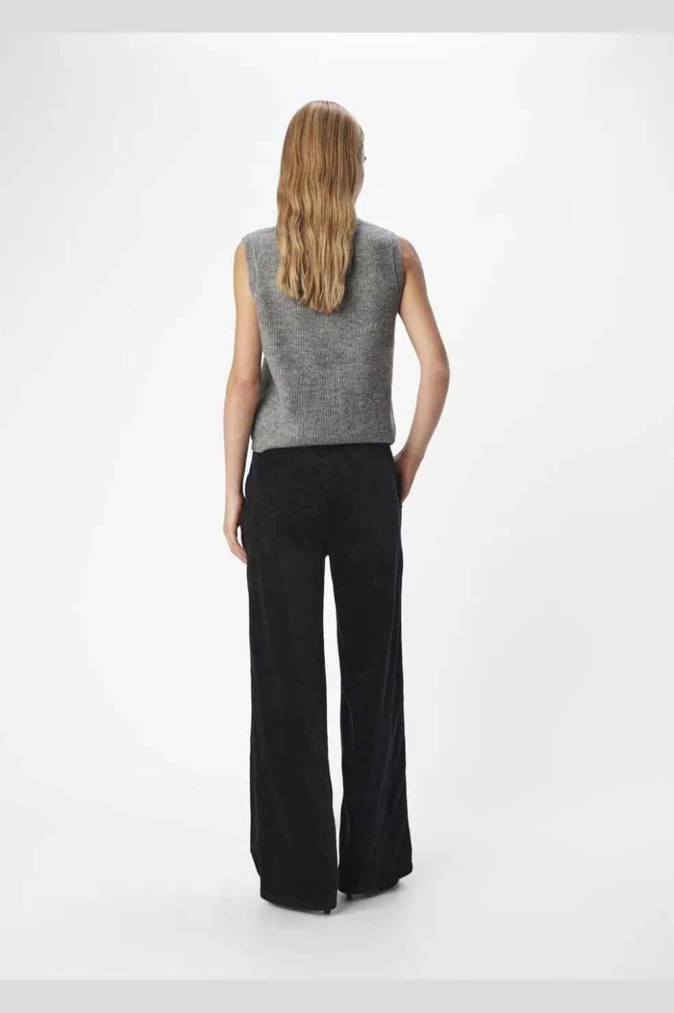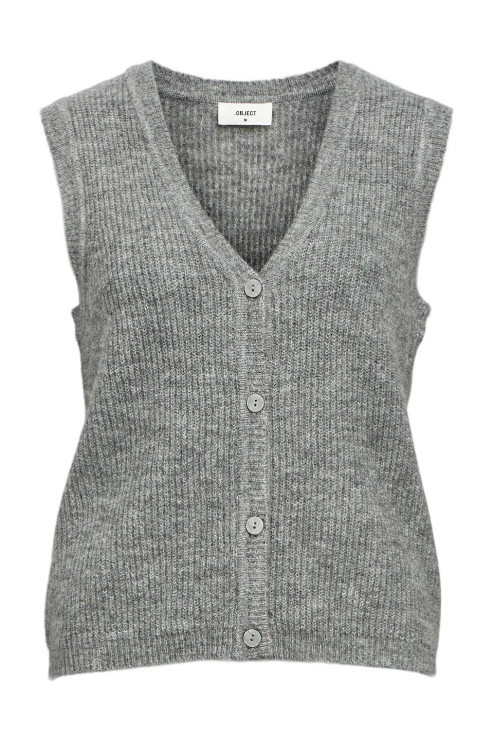 Grå strikket vest fra Object med V-hals og knaplukning. Vesten har en ribbet struktur og et ærmeløst design, der gør den velegnet til lag-på-lag-påklædning.