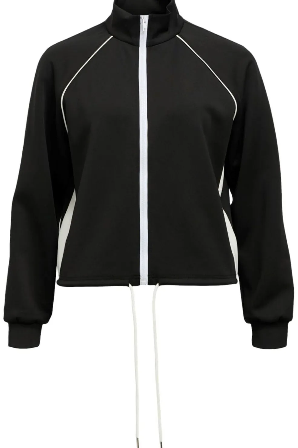 Sort cardigan fra Object med hvide piping-detaljer. Den har en høj hals med lynlås og lange ærmer. Designet kombinerer sporty elementer med praktiske detaljer.