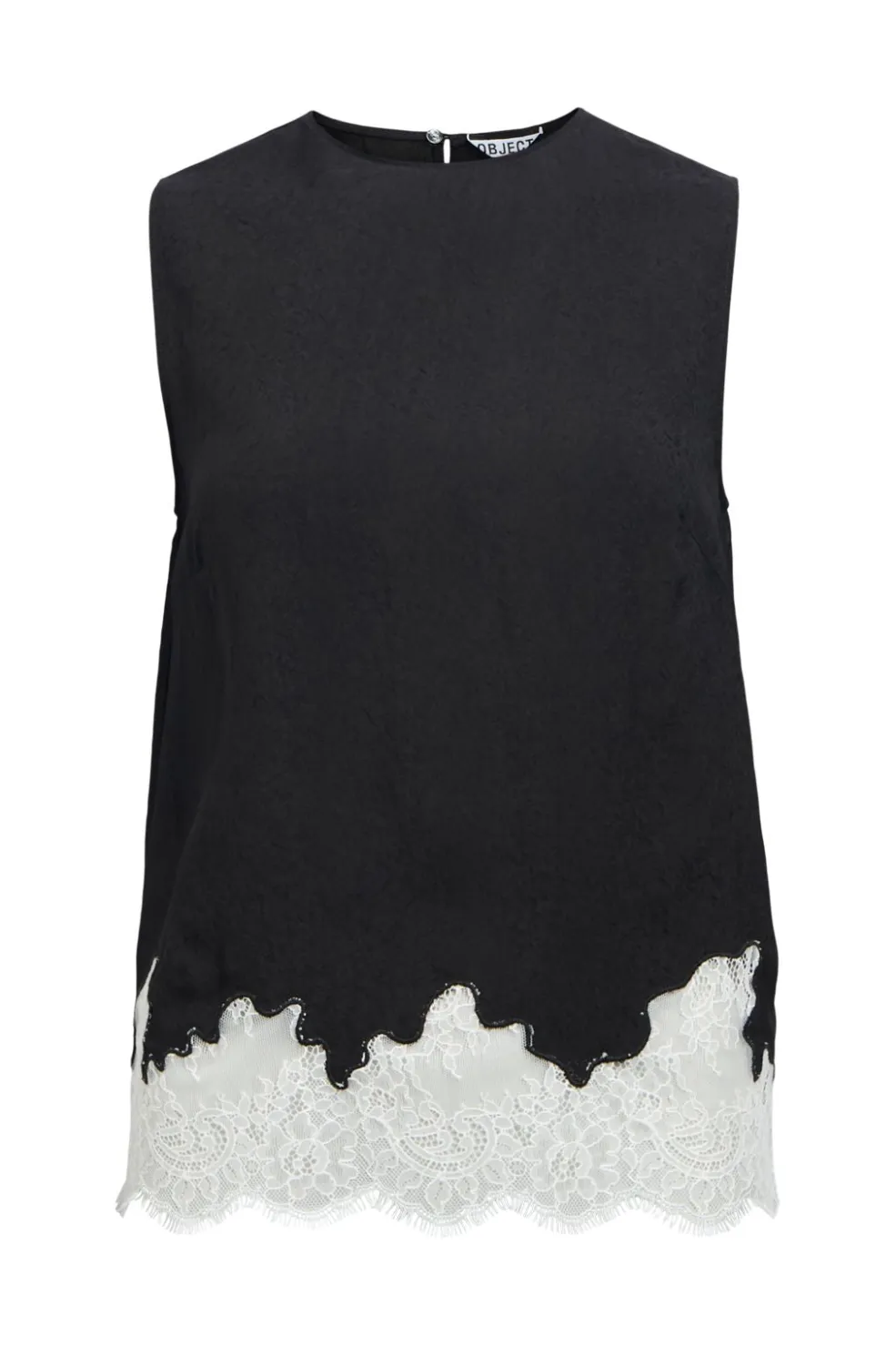 Sort ærmeløs top fra Object med hvide blondekanter. Toppen har en O-hals og lukkes med knapper.