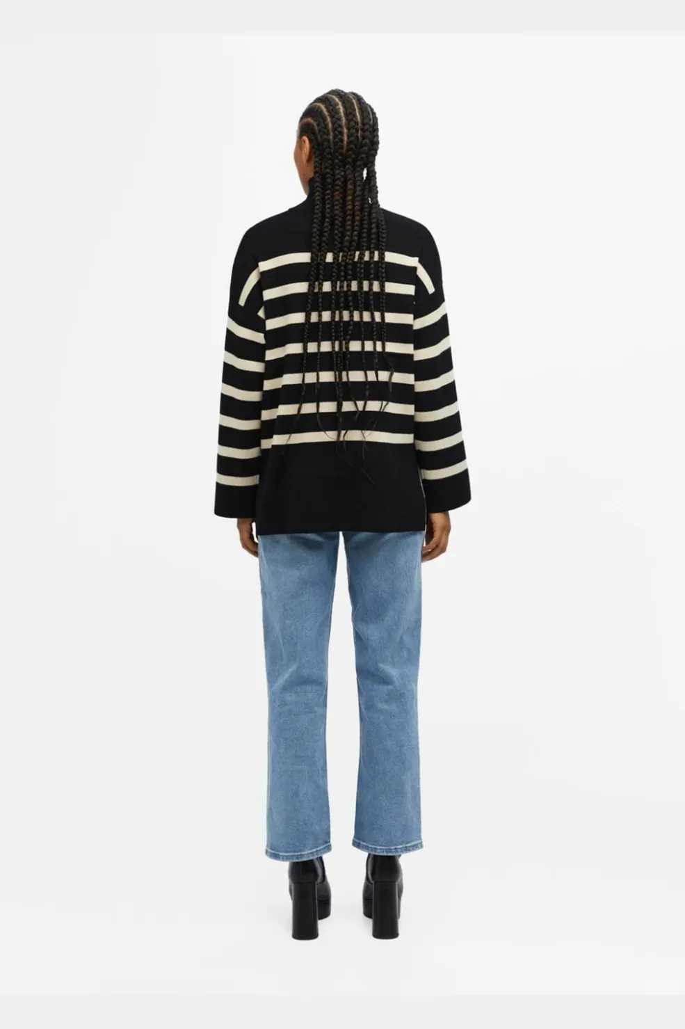 Striktrøje fra Object i netmønstret strik med sorte og cremefarvede striber. Den høje hals har lynlåslukning, og trøjen kommer i et oversized fit med sænkede skuldersømme.