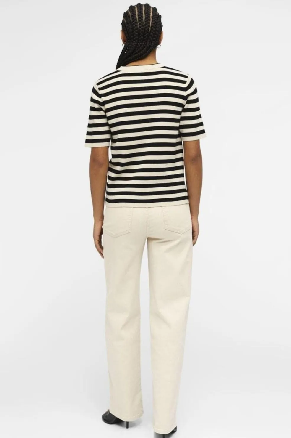 Striktrøje fra Object med korte ærmer i netmønstret strik. Den har striber i sandfarvet og sort, rund hals og en regular pasform. Strikken har en naturlig stræk i materialet.