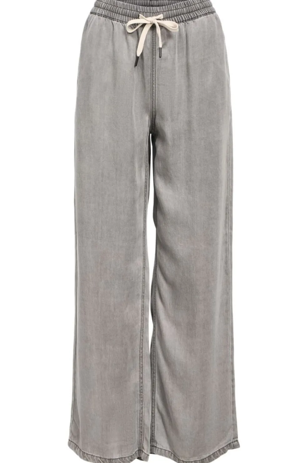 Lysegrå bukser fra Object i Lyocell-denim. Bukserne har en løs pasform og gulvlængde med bindebånd i taljen. De er fremstillet i et blødt og åndbart materiale.