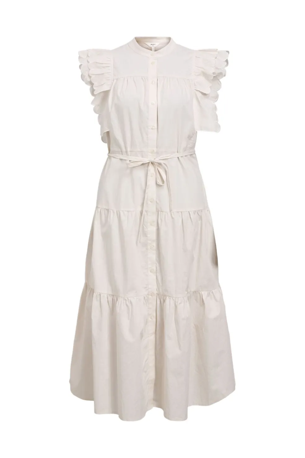 Lang kjole fra Object i hvid sand med skjortekrave og korte ærmer. Kjolen har flæsedetaljer, knaplukning foran og bindebånd i taljen, der giver mulighed for at justere pasformen.