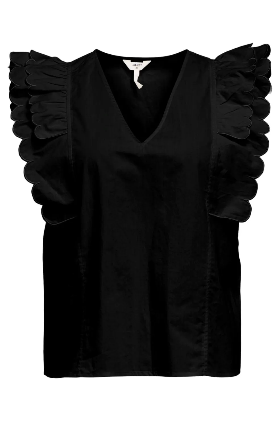 Sort top fra Object med korte ærmer og scallop-detaljer. Toppen har en V-halsudskæring og rynkede ærmer med bølgekant, der giver den et særligt præg.