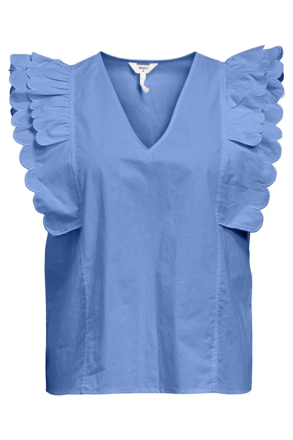 Lyseblå top fra Object med flæser på ærmerne og V-udskæring. Toppen er lavet i en blanding af almindelig og økologisk bomuld med en regular fit.