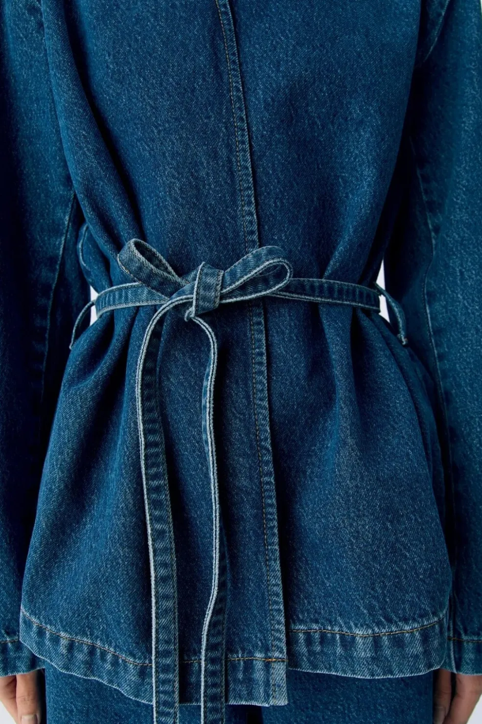 Denimblazer fra Object med omslagsdesign og bindebånd i taljen. Blazeren har en løs pasform med V-halsudskæring og brede ærmer i mediumblå denim.