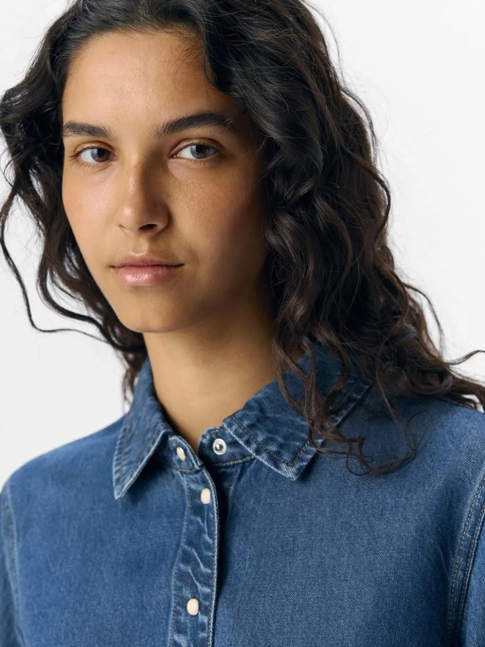 Denimskjorte fra Object i medium blå. Skjorten har en løs pasform med lange ærmer og skjortekrave. De perlemorslignende knapper giver mulighed for at style skjorten både åben og lukket.