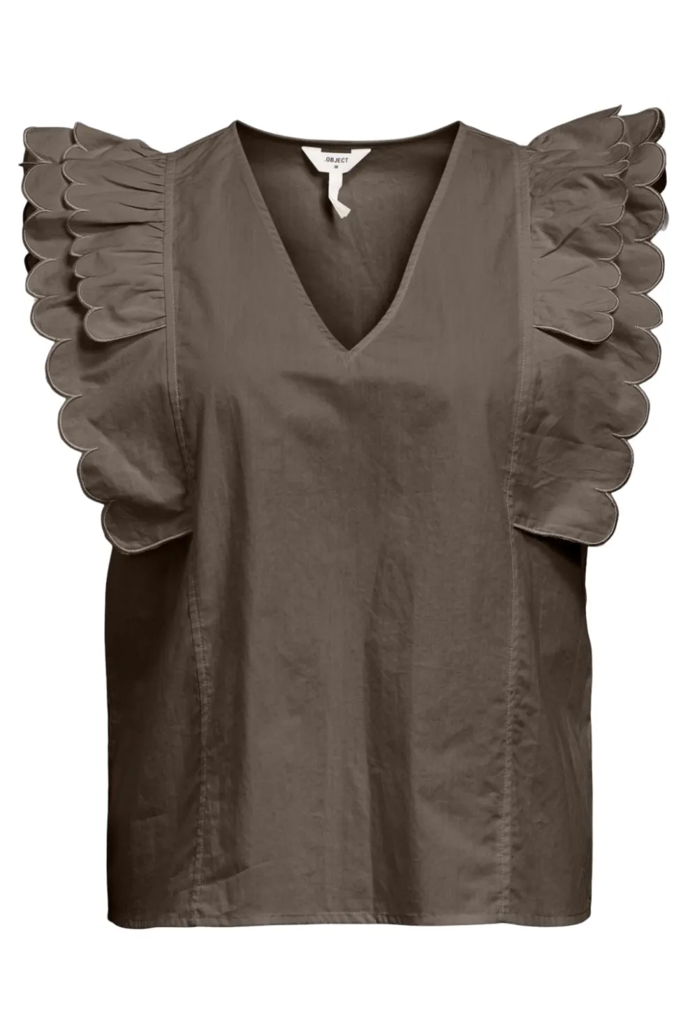 Brun top fra Object med korte ærmer og flæsekanter. Toppen har en V-udskæring og dekorative syninger, der giver den et bølget udtryk.