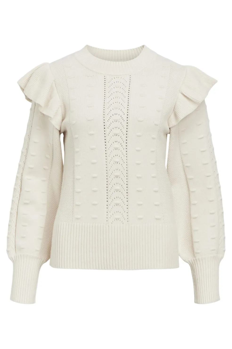 Strikbluse fra Object i hvid sand melange. Den har et mønster med forhøjede prikker og flæsedetaljer ved ærmerne. Den runde halsudskæring og ribbede kanter giver en god pasform.