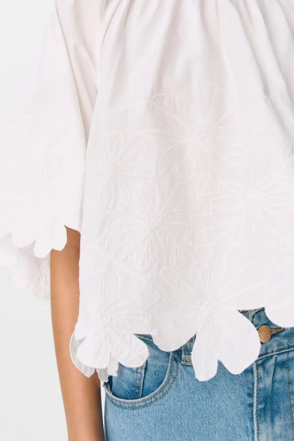 Hvid bluse fra Object med blomsterbroderi langs kanten. Blusen har en løs pasform og korte raglanærmer med en rund halsudskæring og knaplukning foran.