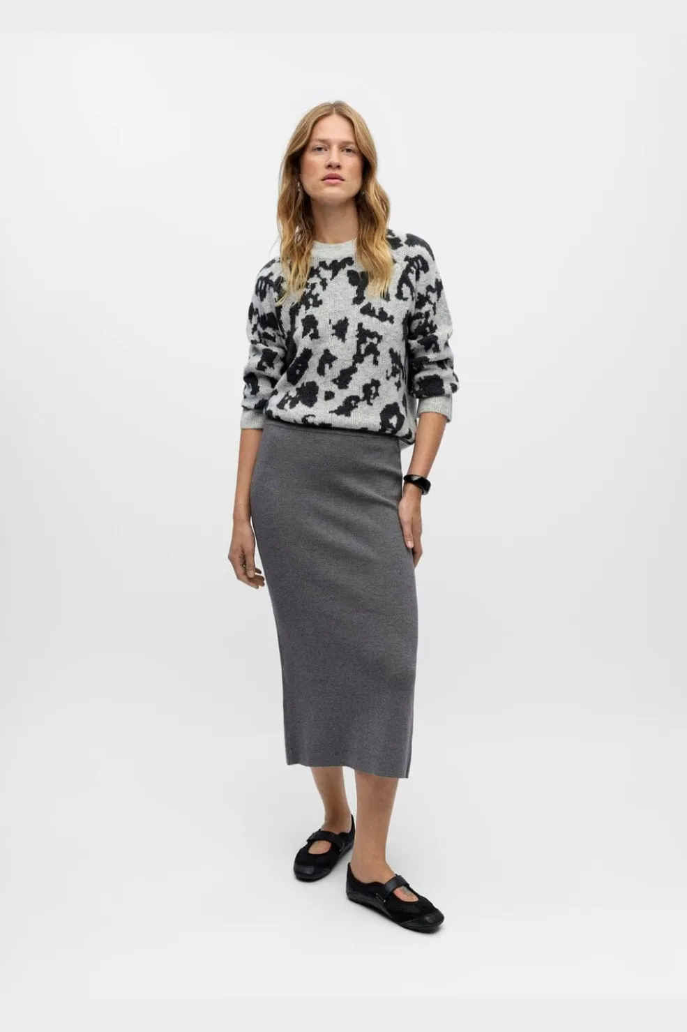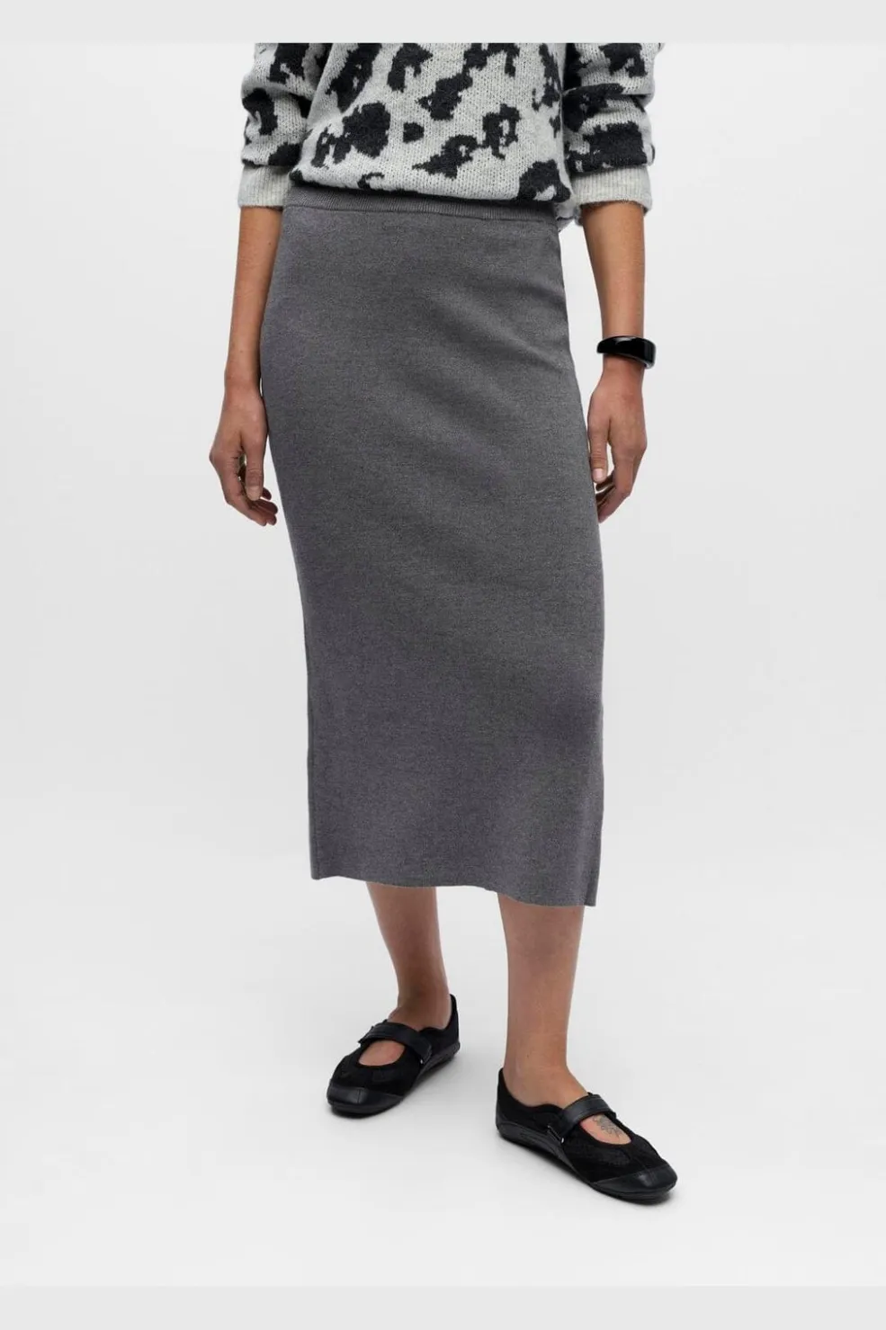 Grå strikket nederdel fra Object med tætsiddende pasform og læg til læggen. Den er lavet i en blød strikket kvalitet med elastisk linning og lille slids bagpå.