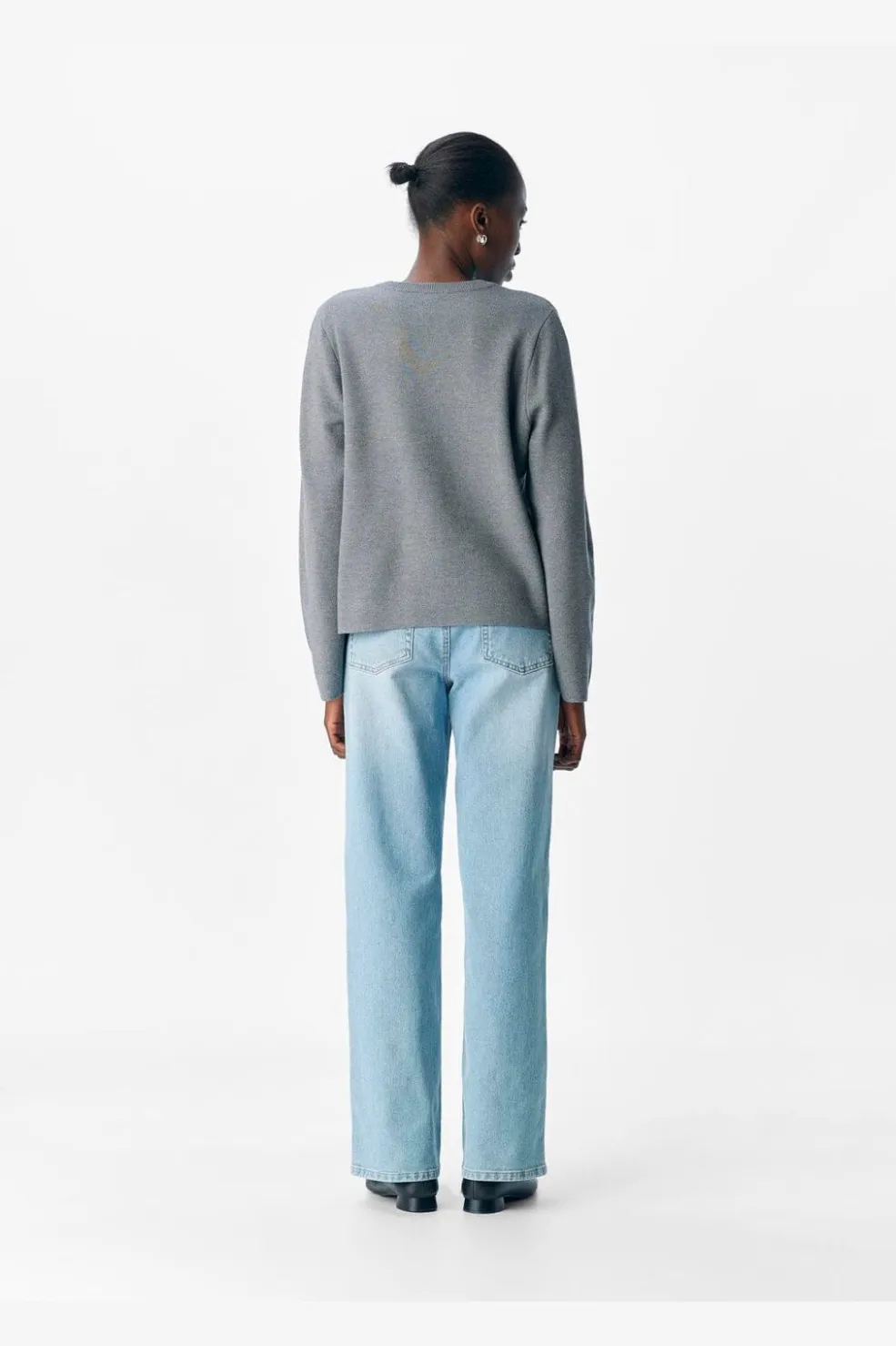 Grå strikpullover fra Object med rund halsudskæring. Den løse pasform og det melerede udtryk gør pulloveren praktisk til både hjemmebrug og afslappet påklædning.