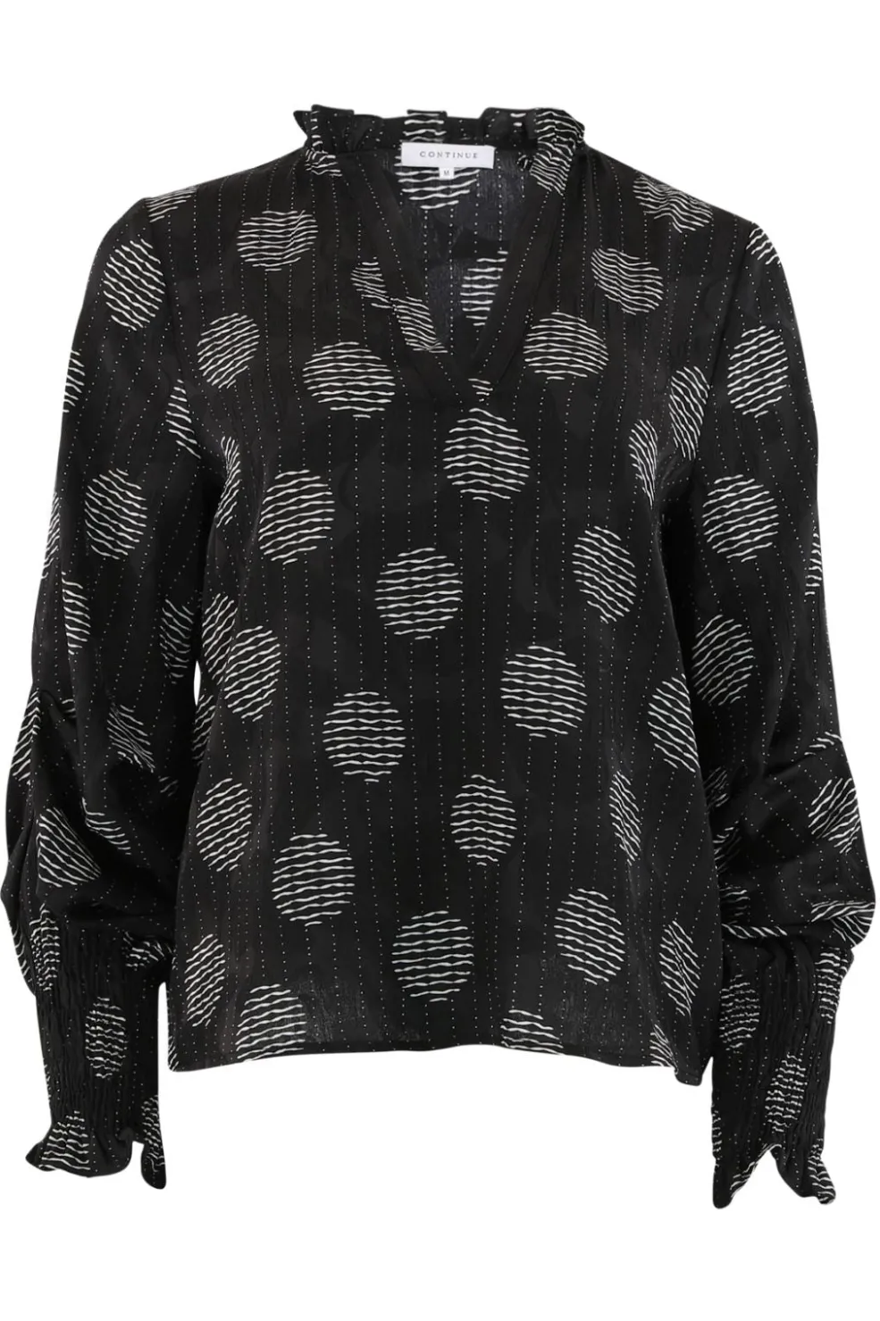 Sort bluse fra Continue med hvidt cirkelmønster. Blusen har v-hals, lange ærmer og flæsedetaljer. Mønsteret består af stribede og solide cirkler på sort baggrund.