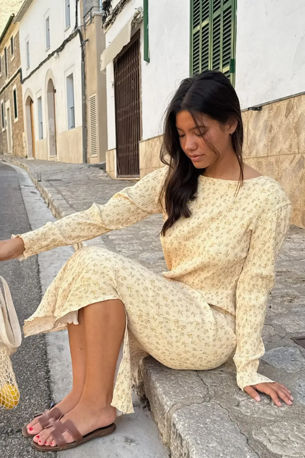 Smuk plissé kjole i gult blomsterprint.Kjolen har lange ærmer og en rund halsudskæring, begge dekoreret med fine flæsedetaljer.Den har slidser i begge sider, hvilket tilføjer et elegant touch til designet.Onesize.