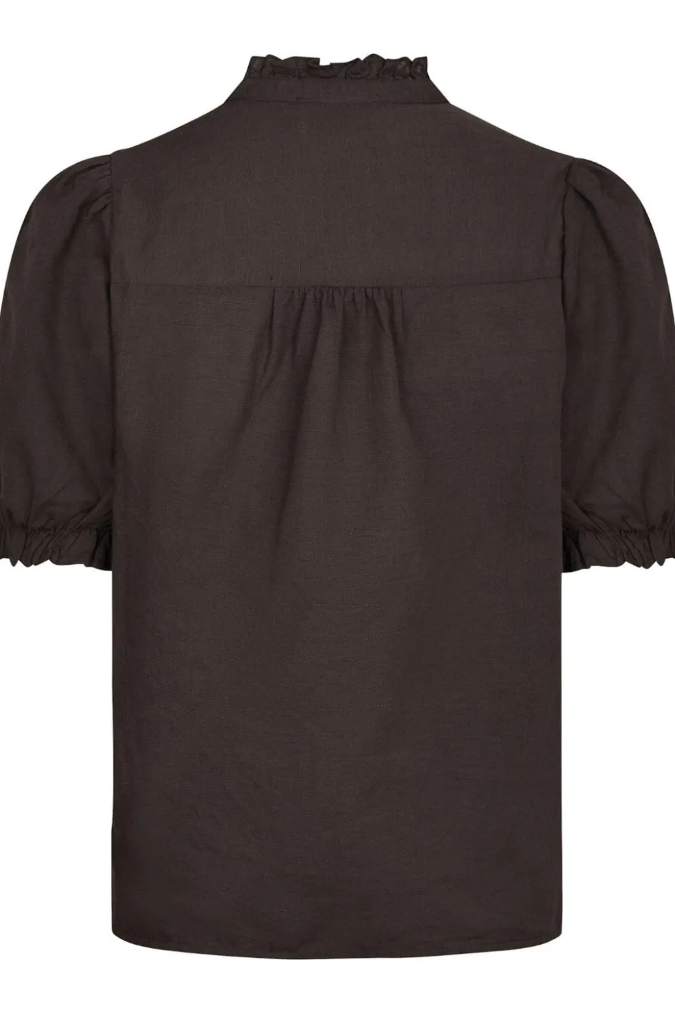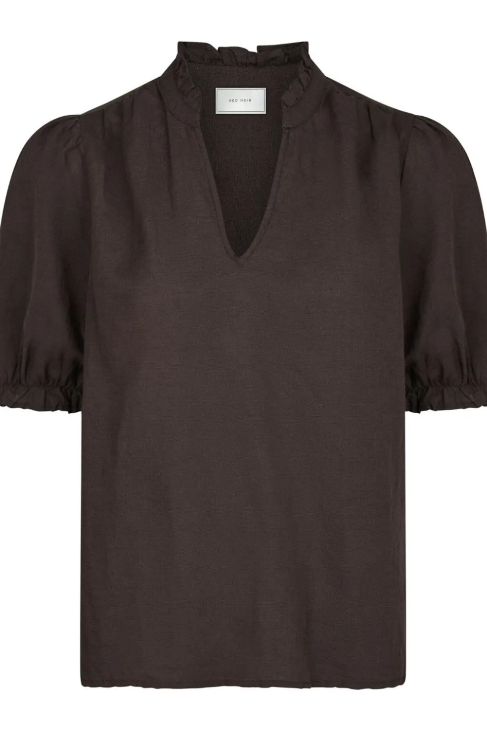 Mørkebrun hørbluse fra Neo Noir med V-udskæring. Blusen har flæsedetaljer ved kraven og korte pufærmer med samling ved håndleddene.