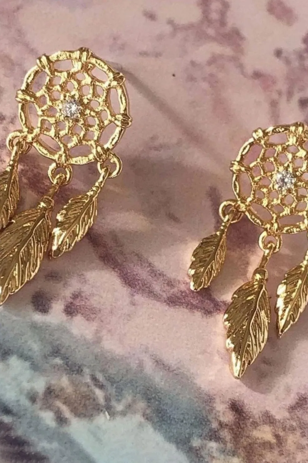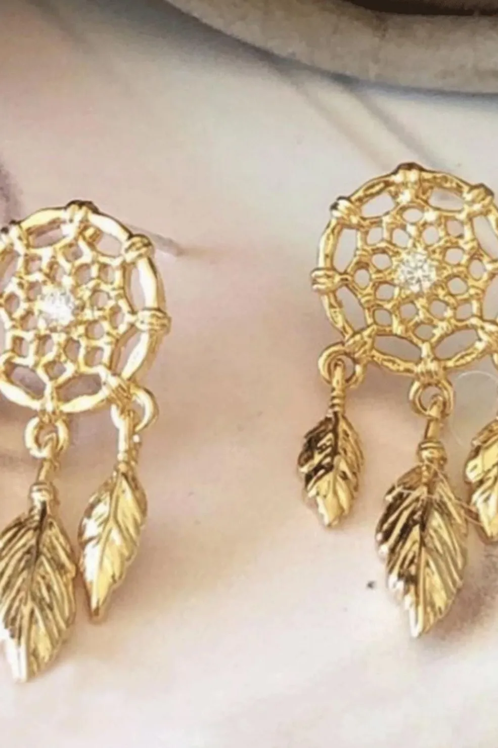Danskproducerede øreringe i drømmefangerdesign med en klar sten i midten og tre bladformede vedhæng. Designet er udført i forgyldt messing.