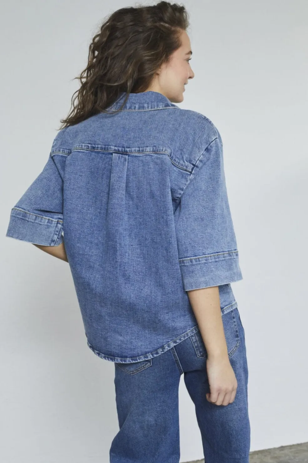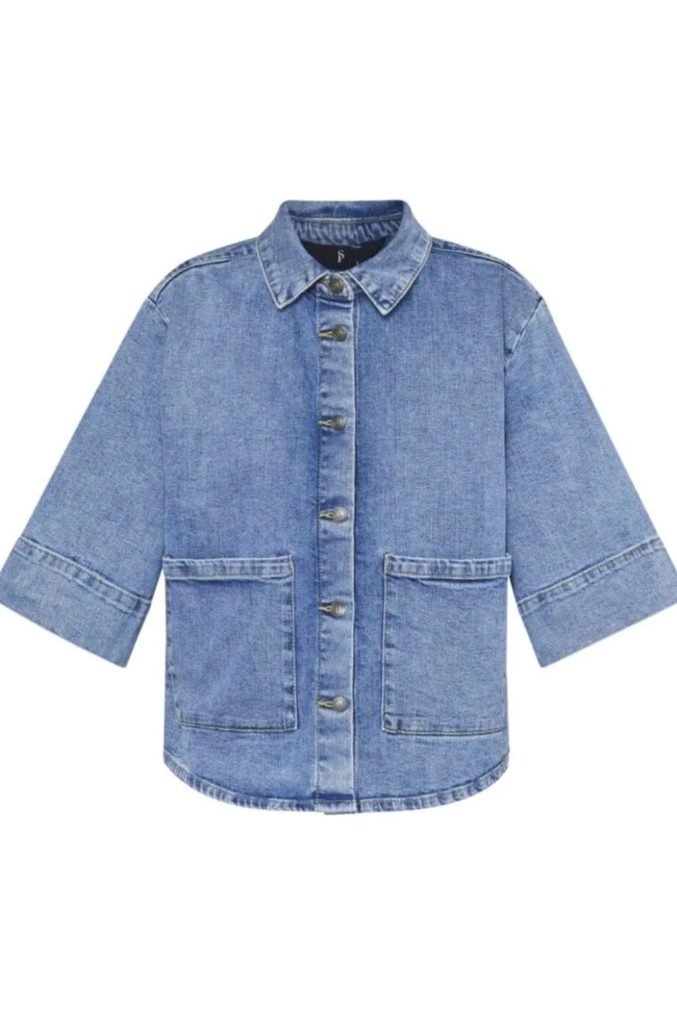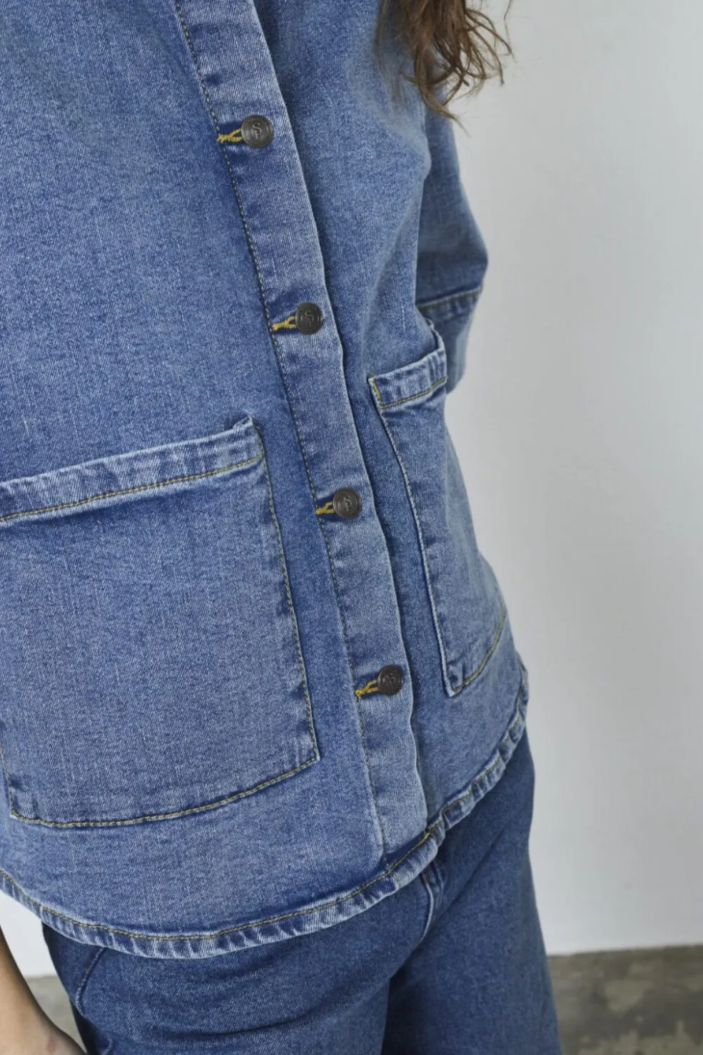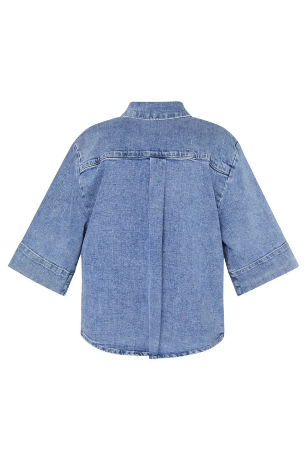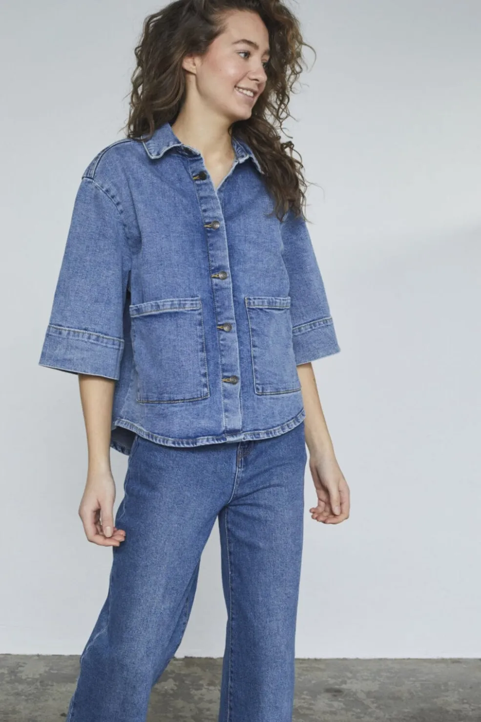 Denimjakke fra Sisters Point i blå denim med trekvartærmer. Jakken har en skjortekrave, knaplukning foran og to praktiske lommer i siderne.