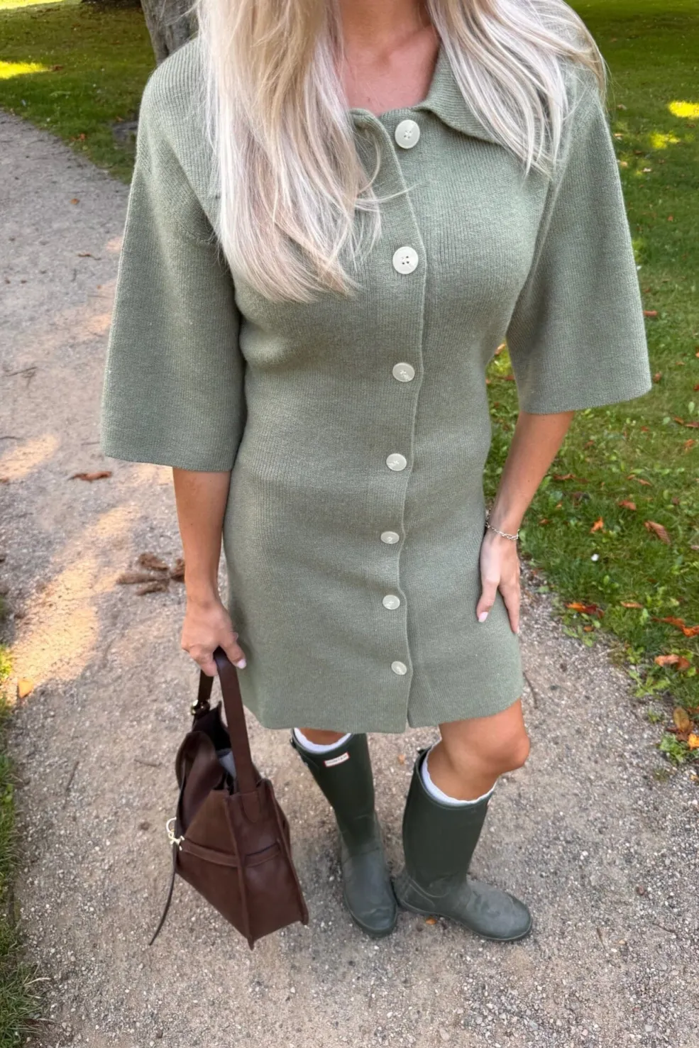Armygrøn strikkjole fra BYIC x Molly&My, lavet af en blød uldblanding. Kjolen har knaplukning foran, skjortekrave og albuelange ærmer.