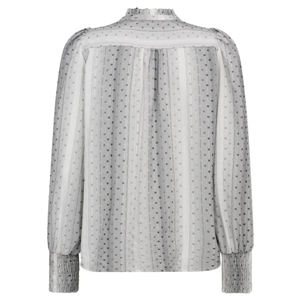 Off-white skjorte fra Co´Couture med et prikket mønster og lodrette striber. Blusen har en V-hals med rynket krave og lange ærmer med samlede manchetter.