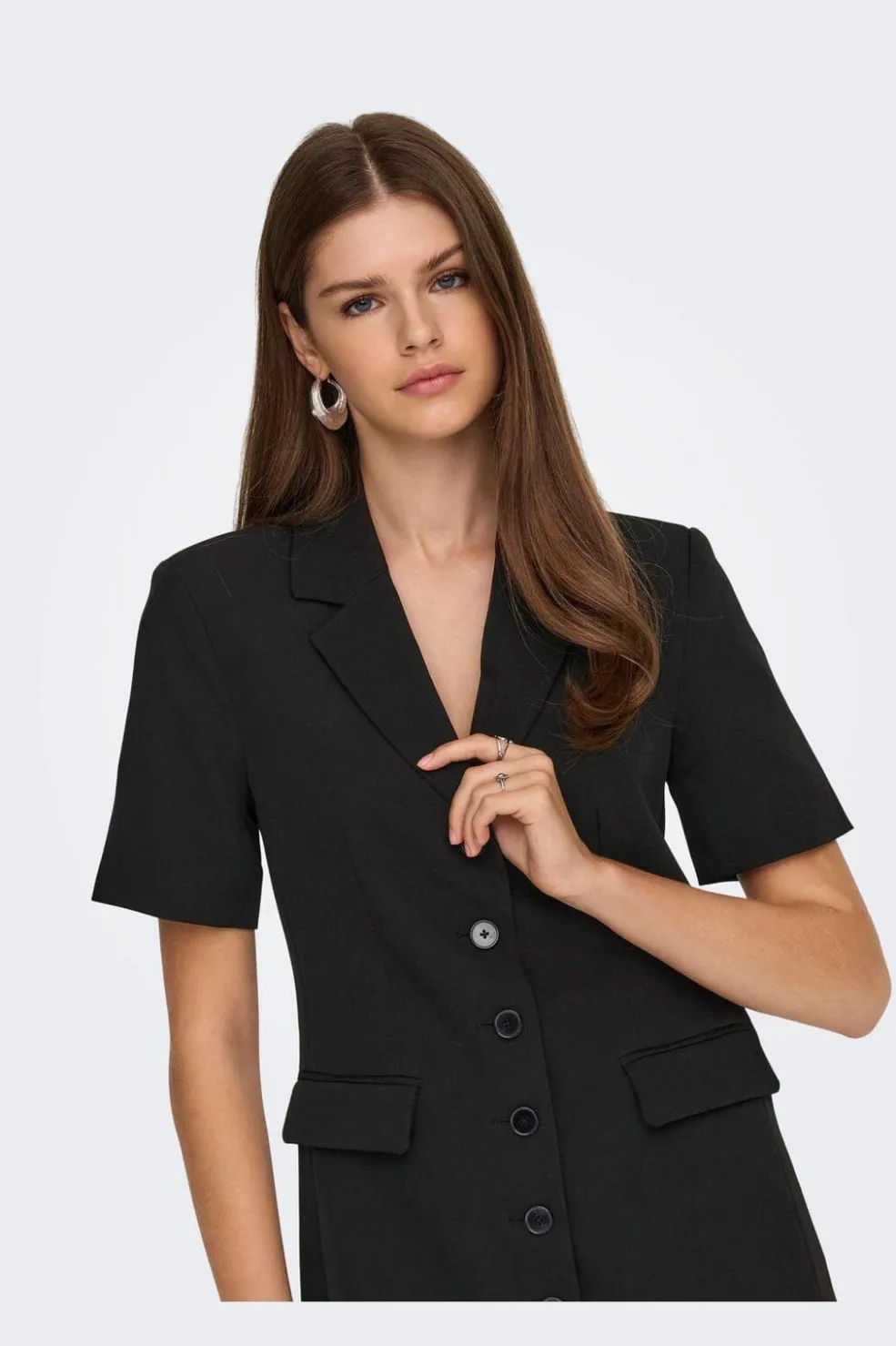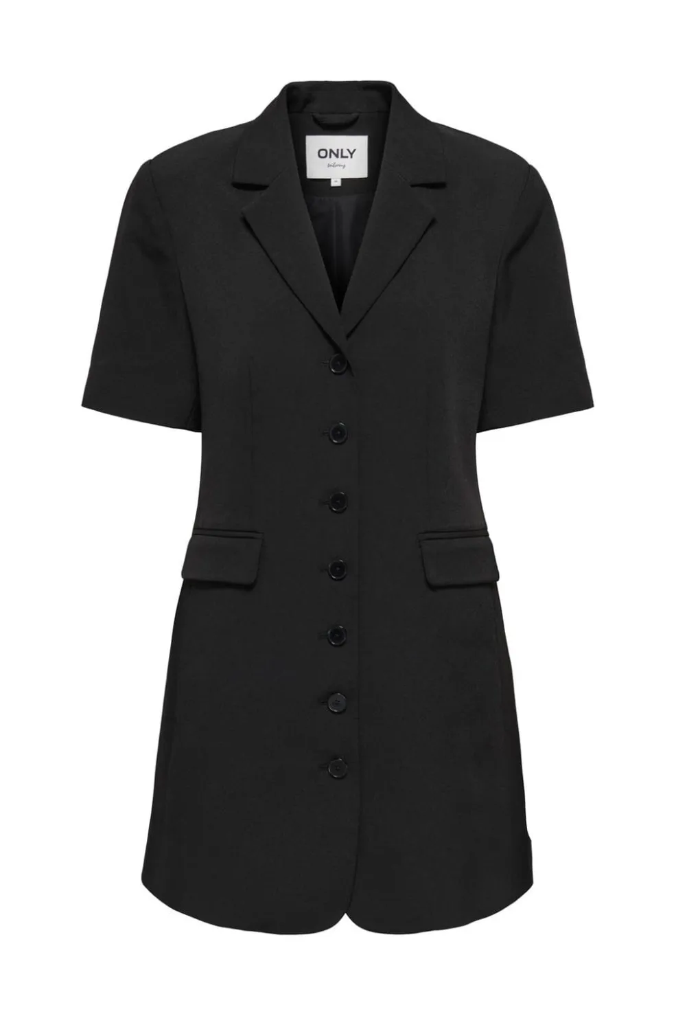 Sort blazer-kjole fra Only med V-hals og knaplukning foran. Kjolen har praktiske lommer på brystet og forsiden, samt korte ærmer og en regular fit-pasform.