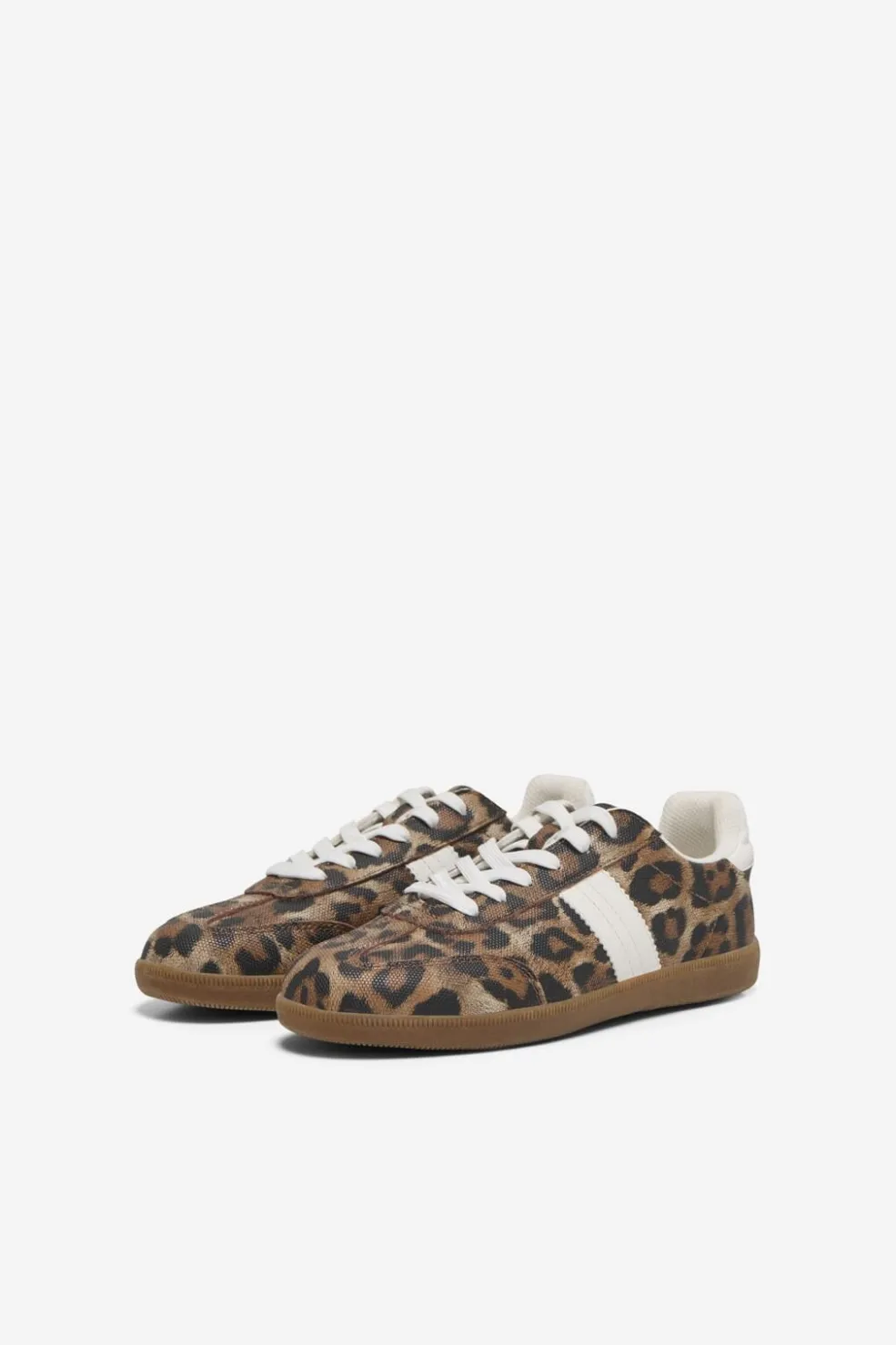 Sneakers fra Only med leopardmønster i sandnuancer. De hvide striber på siden skaber kontrast til mønstret, mens snørebåndene giver en sikker pasform.