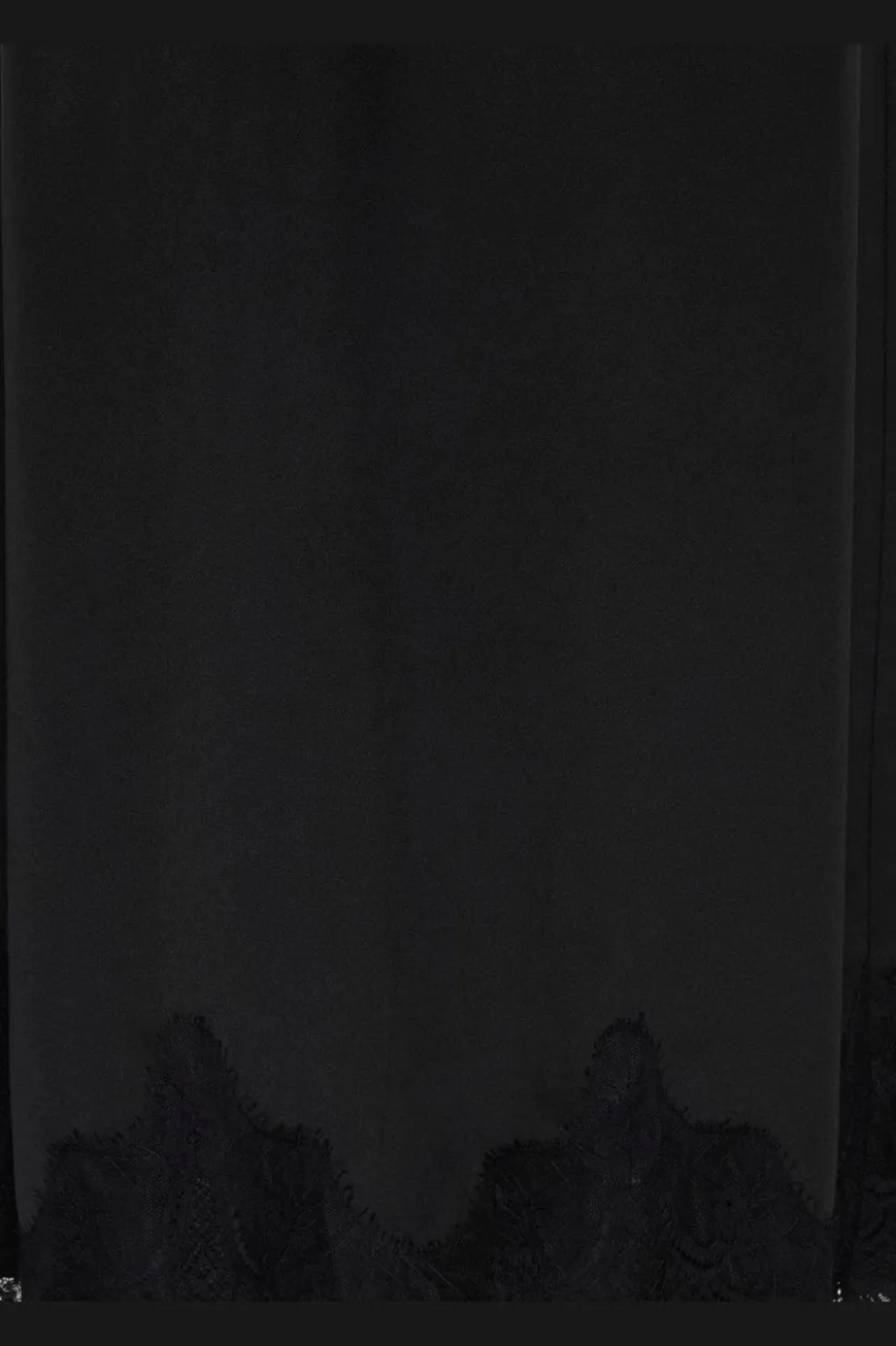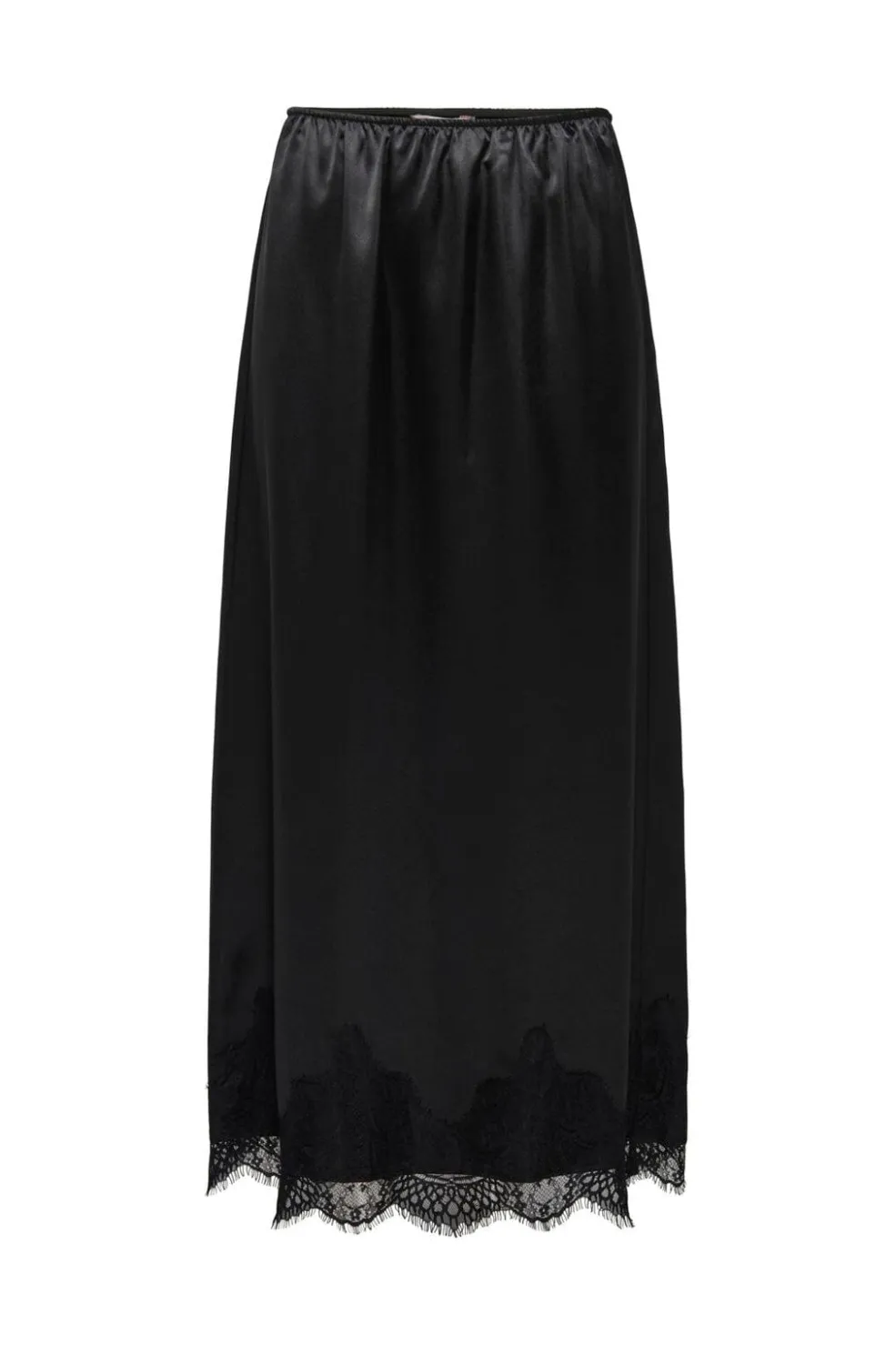 Sort satinnederdel fra Only med blondekant nederst. Nederdelen har en skinnende overflade og en elastisk talje med pulloverlukning.