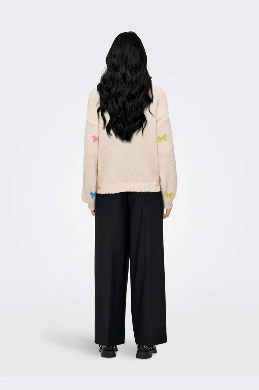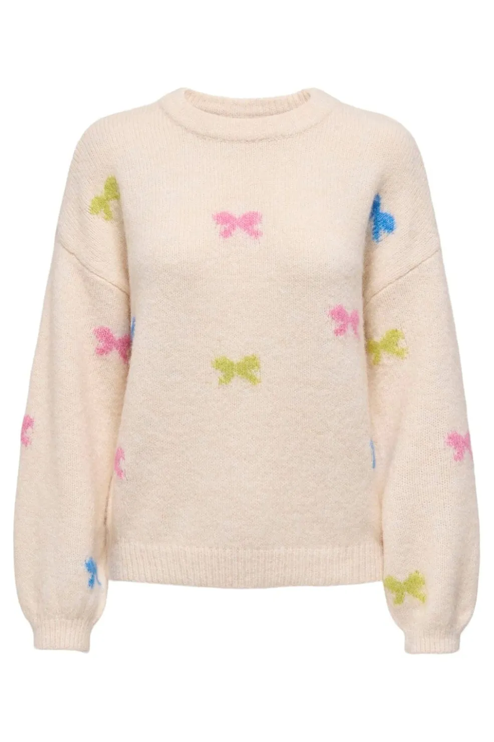 Striktrøje fra Only i en lys cremefarve med farvede sløjfer som mønster. Trøjen har en rund halsudskæring og lange ærmer.