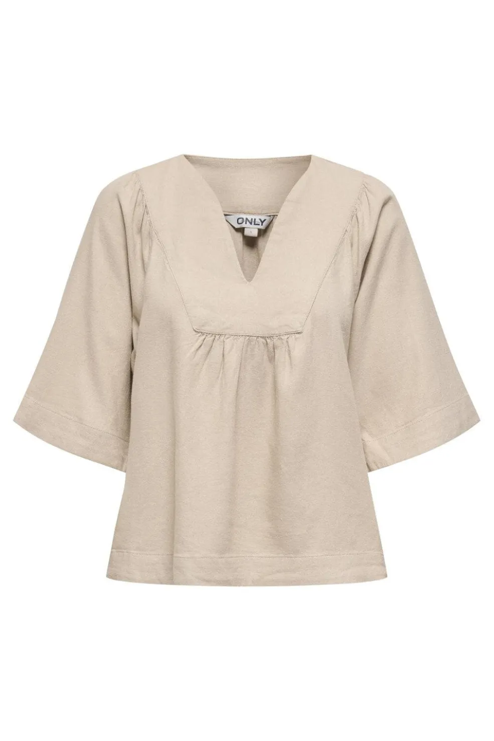 Beige bluse fra Only med V-hals og 2/4 ærmer. En luftig top i hørblanding med løs pasform og flæsedetaljer.