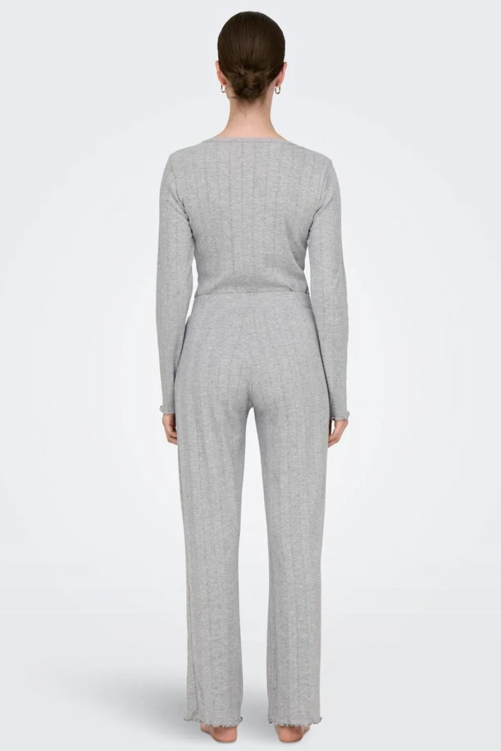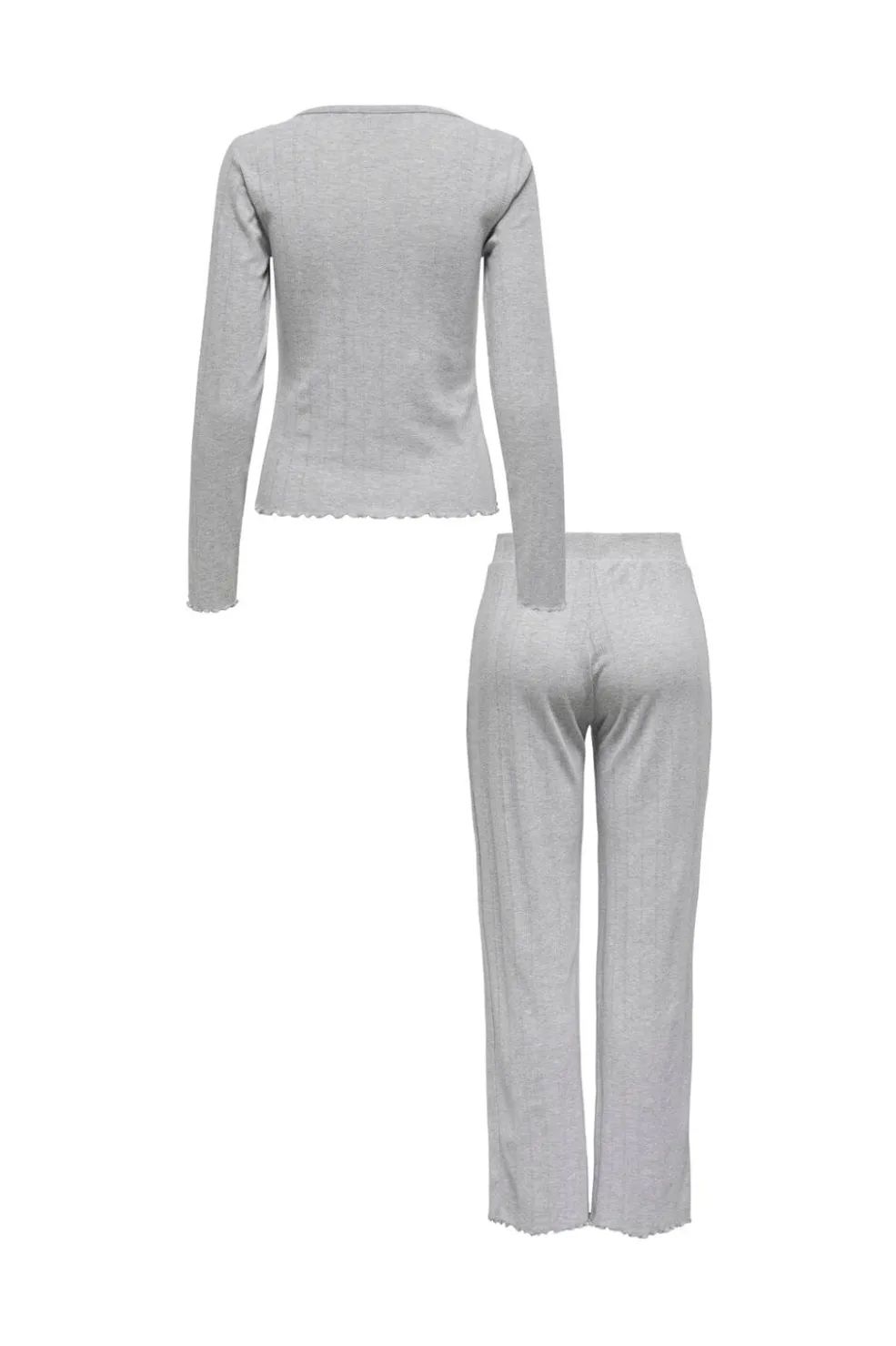 Pyjamassæt fra Only, lavet af 50 % bomuld og 50 % polyester i en lys grå meleret nuance. Sættet har en ribbet tekstur og rynkede kanter ved ærmerne og buksebenene.