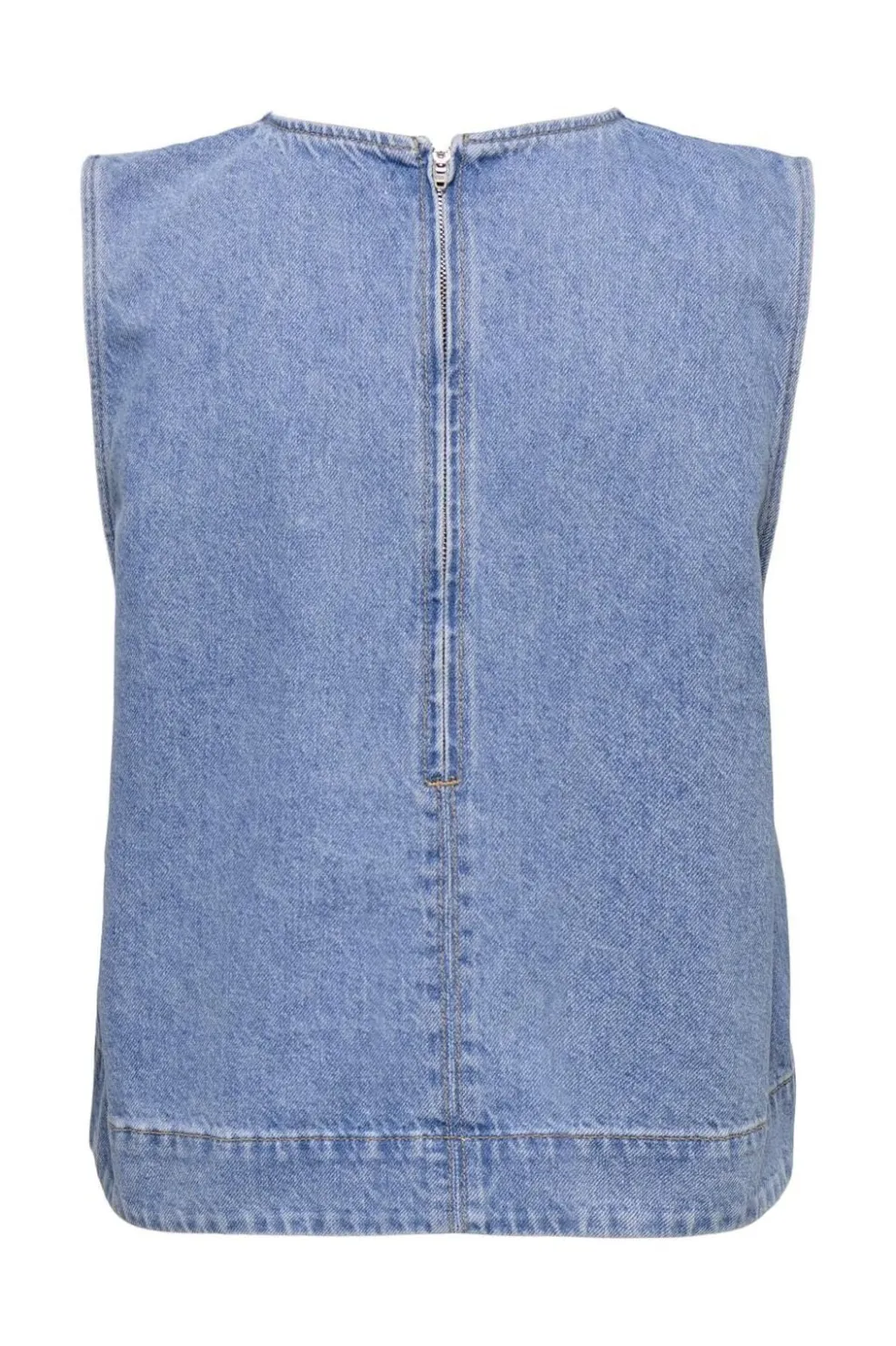 Ærmeløs denimtop fra Only i lys blå. Toppen har en rund halsudskæring og lynlås på ryggen. De dekorative syninger giver toppen et rent udtryk.