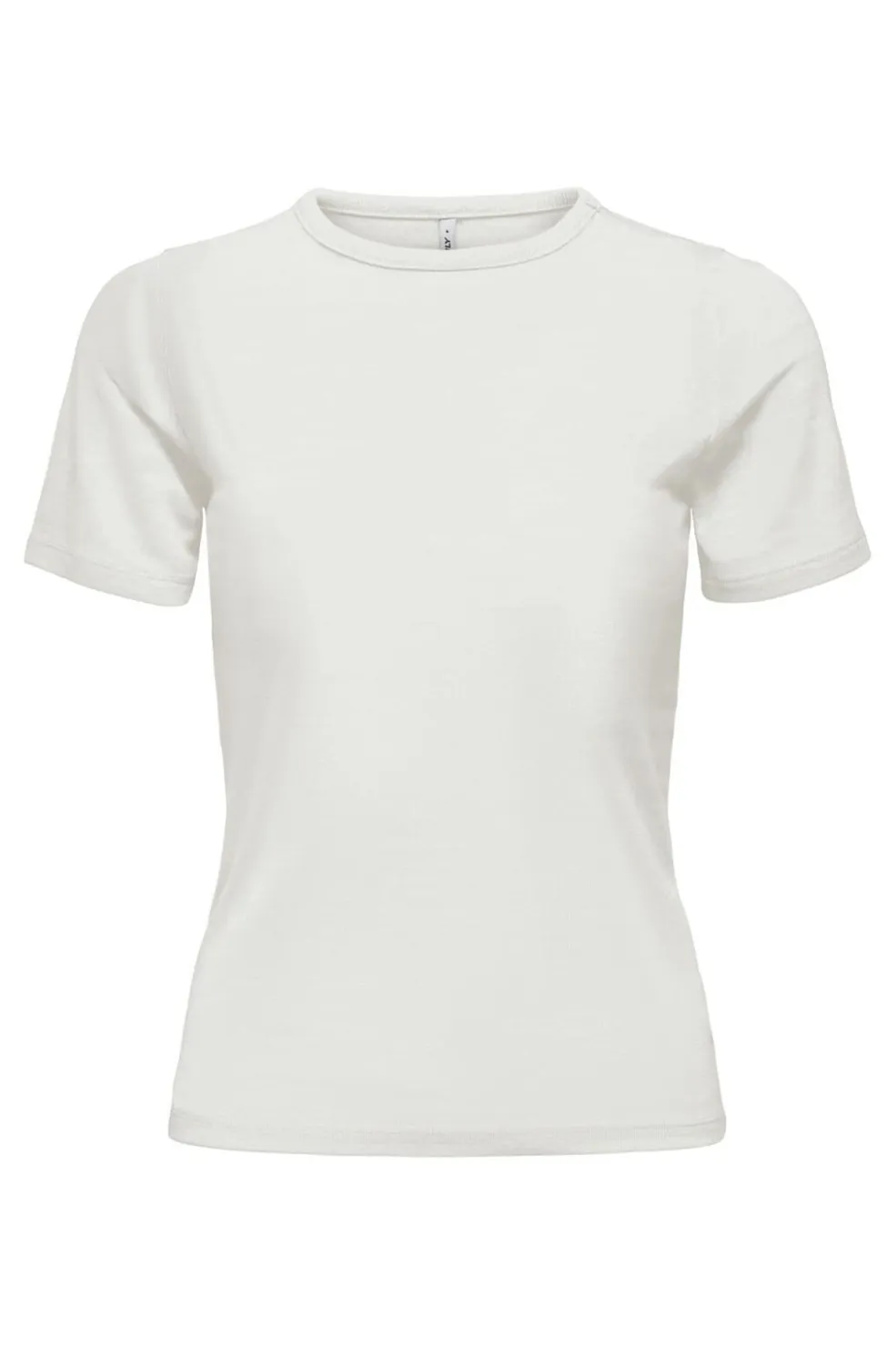 Ribstrikket top fra Only i en lys farve. Toppen har en rund halsudskæring og korte ærmer, der giver en kropsnær pasform med stretch i stoffet.